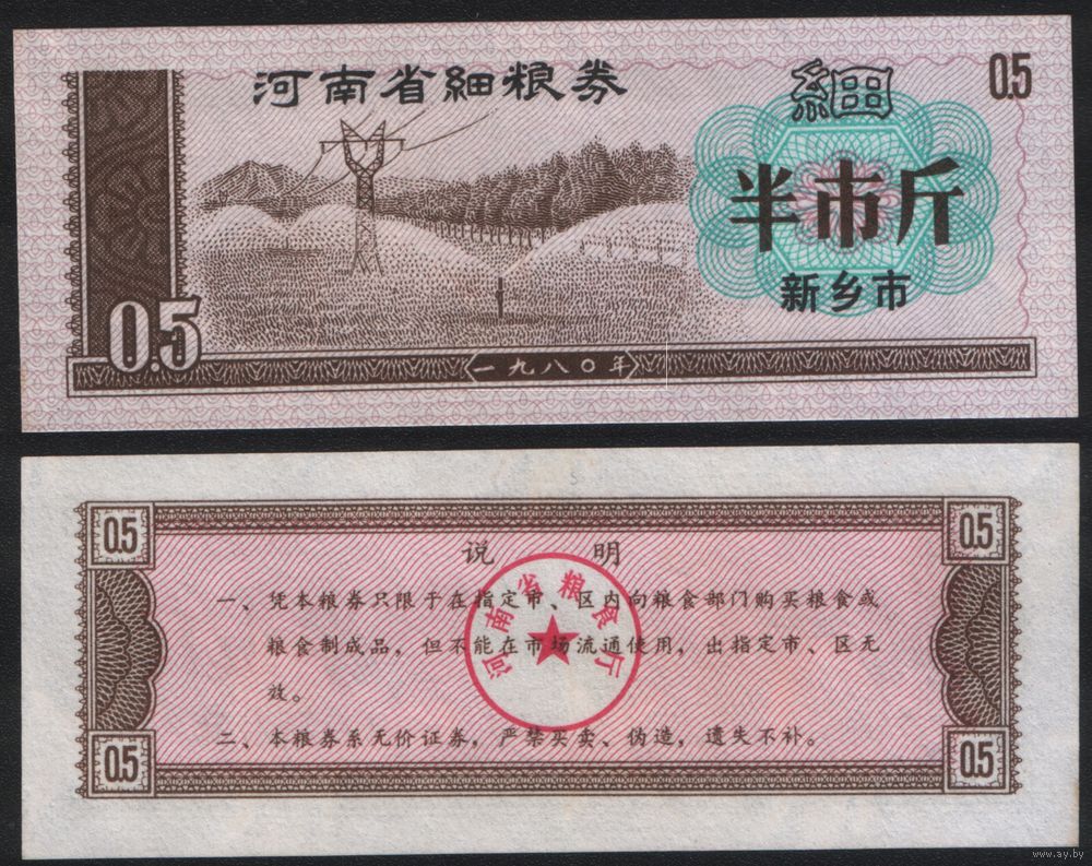 Китай 1980 год Хэнань пров. г.Синьсян прод.талон (продовольствие) на 0,5ед (рис) (rd04 =