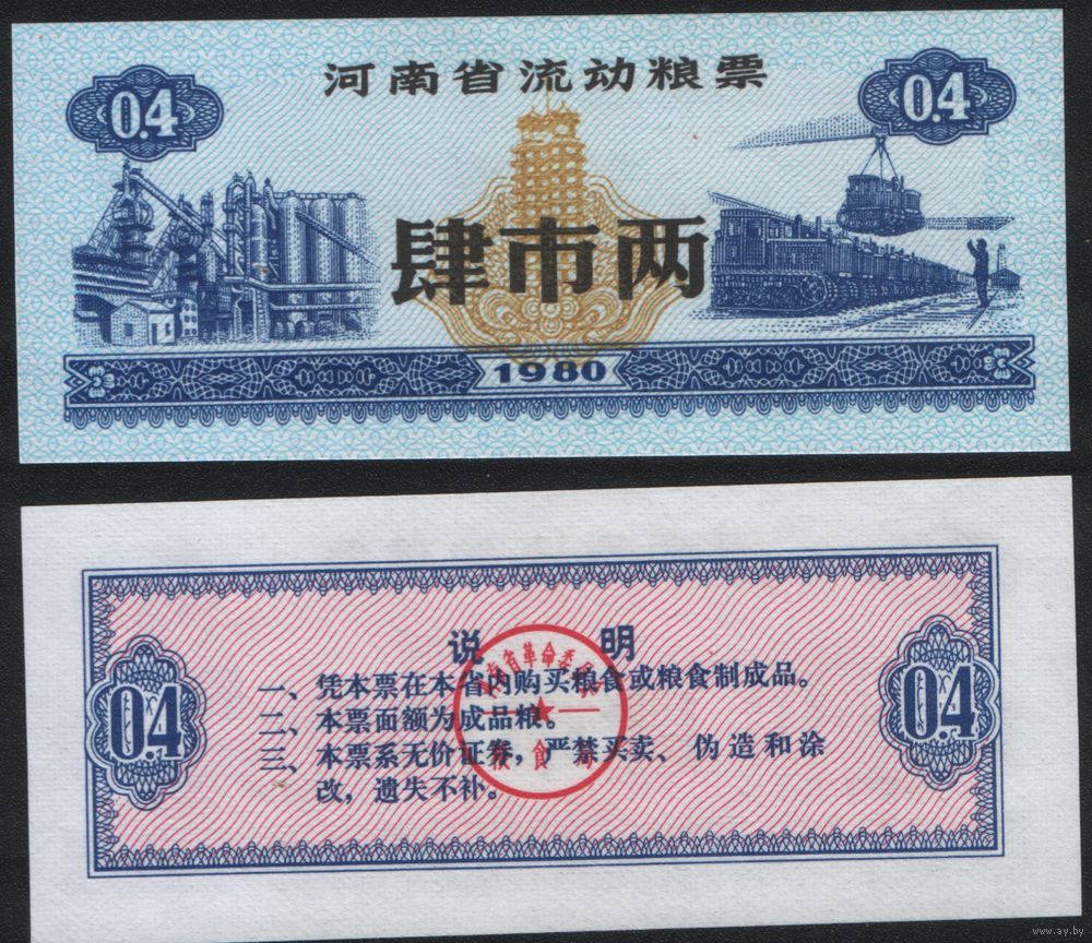 Китай 1980 год Хэнань пров. прод.талон (продовольствие) на 0,4ед (рис) (rd04 =