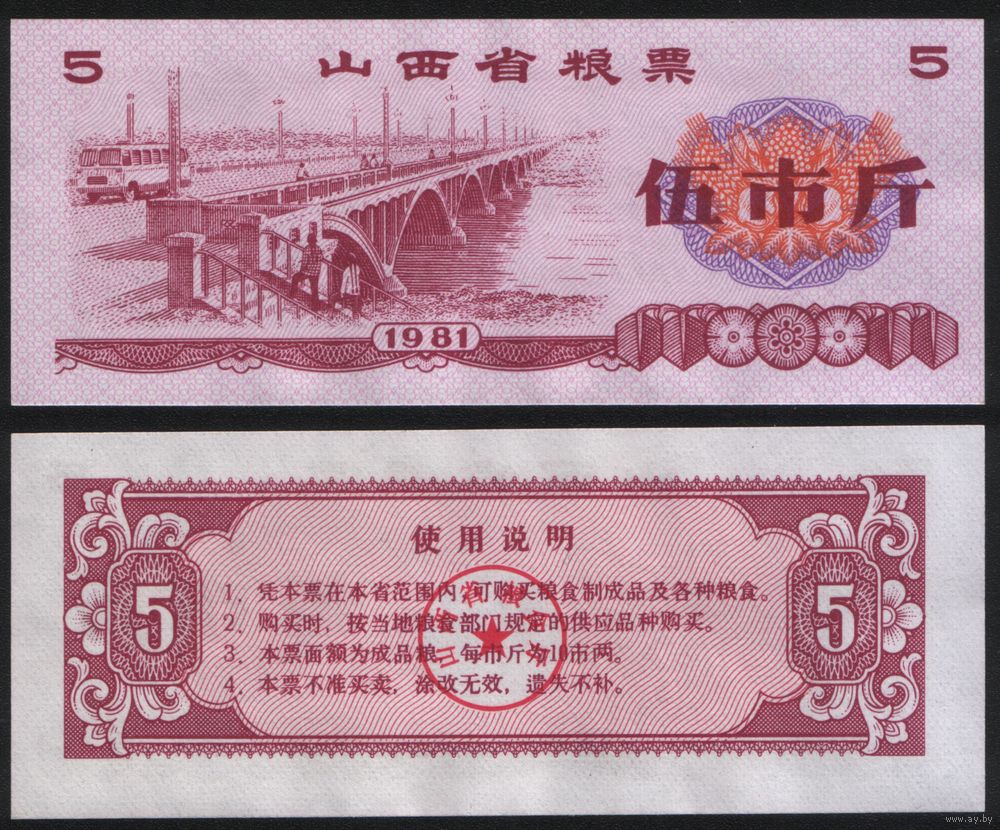 Китай 1981 год Шаньси пров. прод.талон (продовольствие) на 5ед=5чжин=2,5кг (рис) (rd05 =