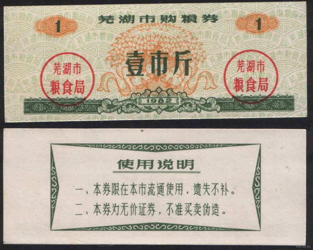 Китай 1982 год Уху город прод.талон (продовольствие) на 1ед=1чжин=0,5кг (рис) (rd04 =