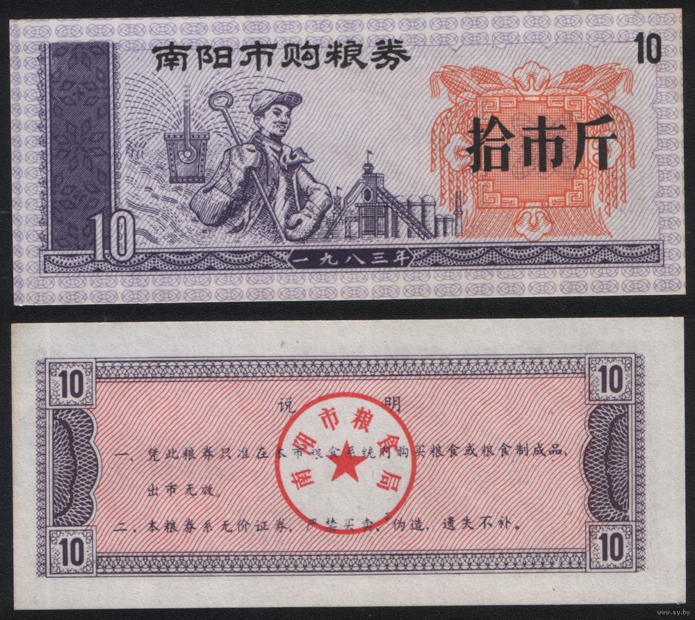 Китай 1983 год Наньянг прод.талон (продовольствие) на 10ед=10чжин=5кг (рис) (rd04 =