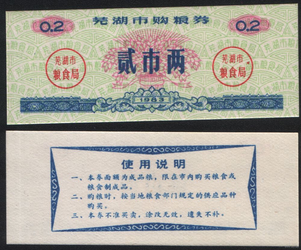 Китай 1983 год Уху прод.талон (продовольствие) на 0,2ед=2лян=100г (рис) (rd05 =