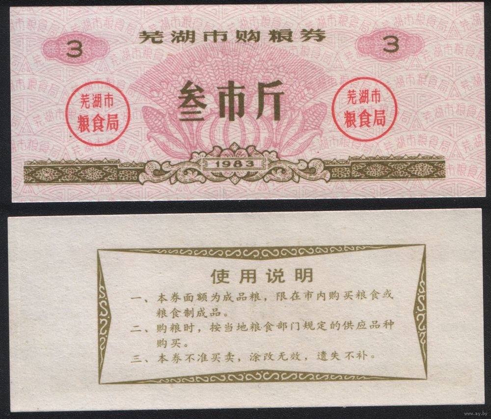 Китай 1983 год Уху прод.талон (продовольствие) на 3ед=3чжин=1,5кг (рис) (rd04 =