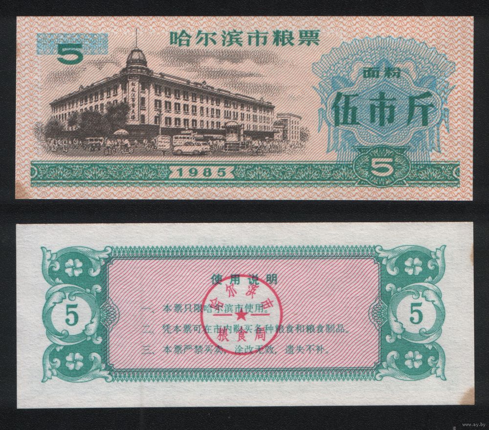 Китай 1985 год г.Харбин(Haerbin) прод.талон (мучной) на 5ед=5чжин(цзинь)=2,5кг торг