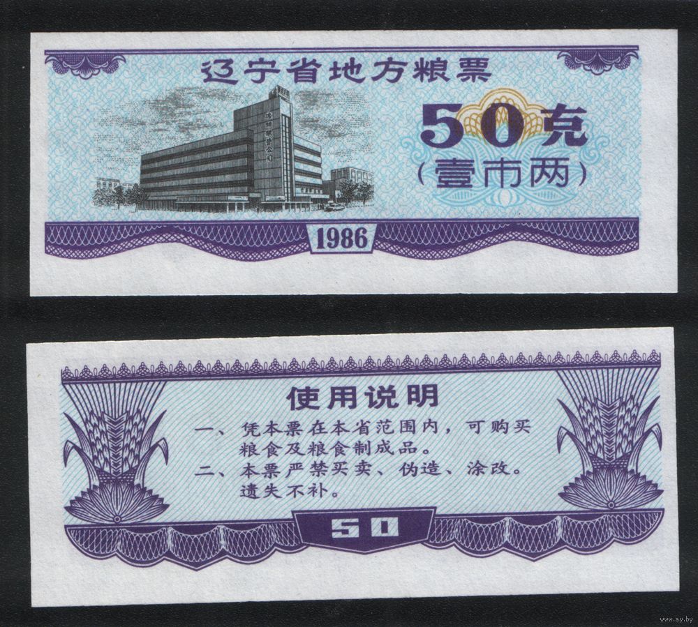 Китай 1986 год пров.Ляонин(Liaoning) местн.прод.талон на 1лян=50гр торг