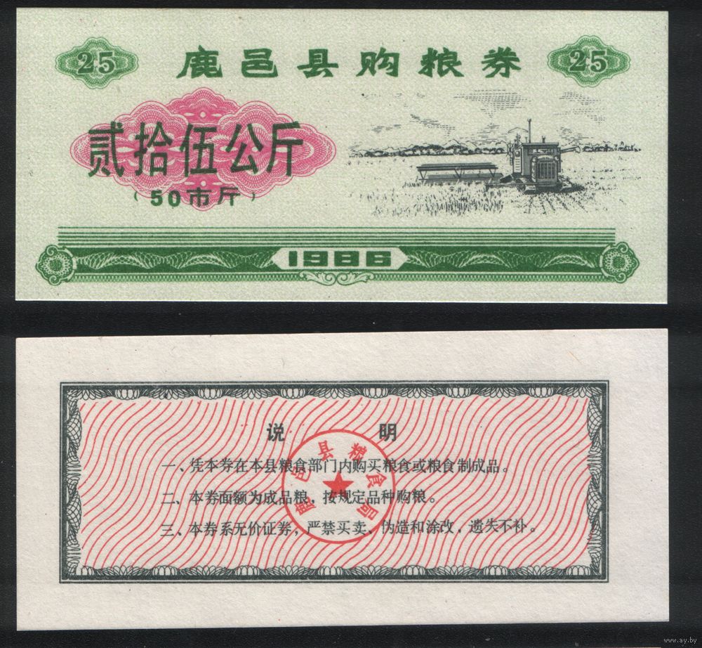 Китай 1986 год уезд.Луи(Луй)(Haerbin)пров.Хэнань талон на покуп.питания на 25ед=50чжин(цзинь)=25кг торг