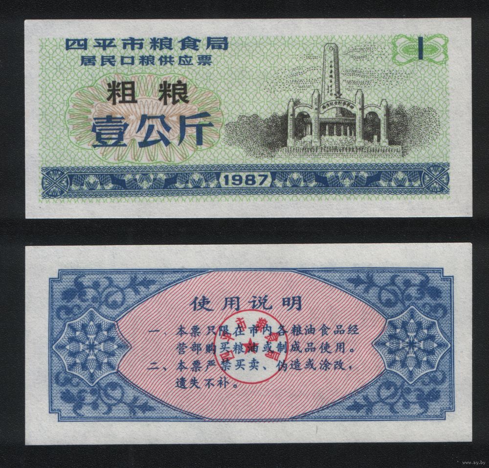 Китай 1987 год г.Сыпин(Siping)пров.Гирин прод.талон (груб.зерно) на 1ед=1кг ТОРГ