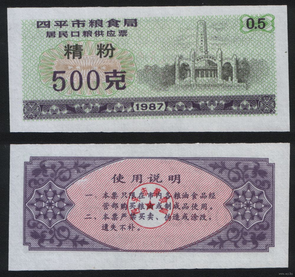 Китай 1987 год г.Сыпин(Siping)пров.Гирин прод.талон (мелк.порошок) на 0,5ед=500гр (rd05 =