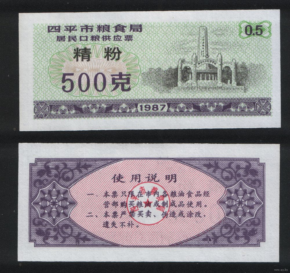 Китай 1987 год г.Сыпин(Siping)пров.Гирин прод.талон (мелк.порошок) на 0,5ед=500гр ТОРГ