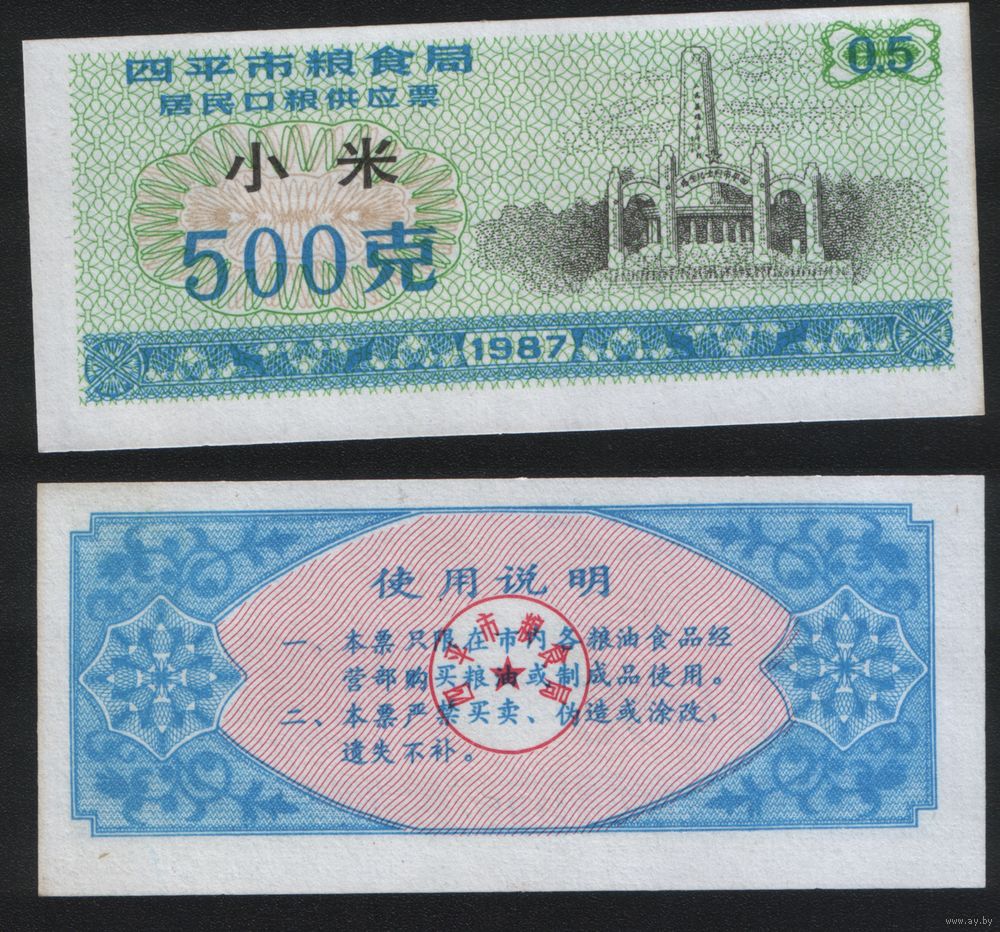 Китай 1987 год г.Сыпин(Siping)пров.Гирин прод.талон (пшено) на 0,5ед=500гр (rd08 =
