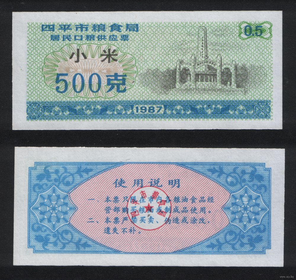 Китай 1987 год г.Сыпин(Siping)пров.Гирин прод.талон (пшено) на 0,5ед=500гр ТОРГ