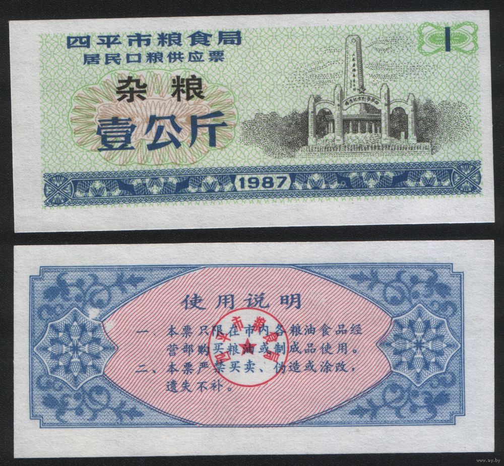 Китай 1987 год г.Сыпин(Siping)пров.Гирин прод.талон (разн.зерно) на 1ед=1кг (rd08 =