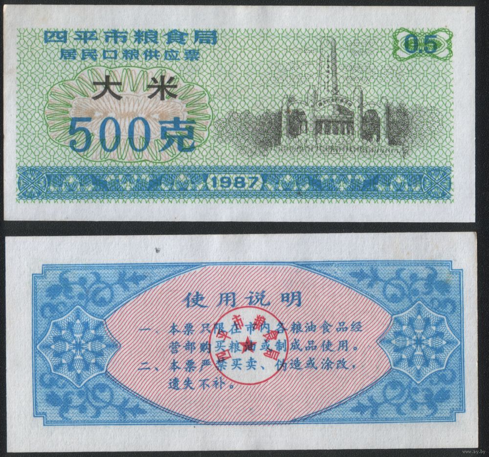 Китай 1987 год г.Сыпин(Siping)пров.Гирин прод.талон (рис) на 0,5ед=500гр (rd07 =