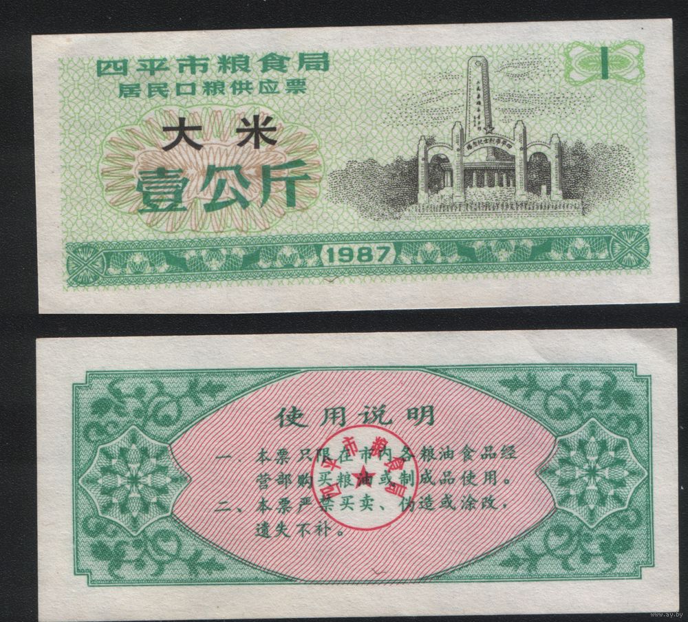 Китай 1987 год г.Сыпин(Siping)пров.Гирин прод.талон (рис) на 1ед=1кг (rd08 =