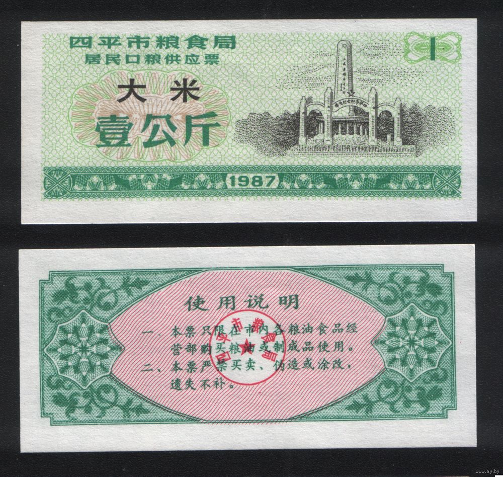 Китай 1987 год г.Сыпин(Siping)пров.Гирин прод.талон (рис) на 1ед=1кг ТОРГ