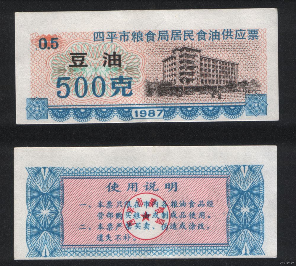 Китай 1987 год г.Сыпин(Siping)пров.Гирин прод.талон (соевое масло) на 0,5ед=500гр ТОРГ