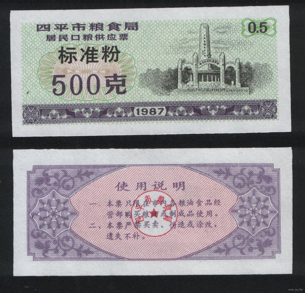 Китай 1987 год г.Сыпин(Siping)пров.Гирин прод.талон (станд.порошок) на 0,5ед=500гр ТОРГ