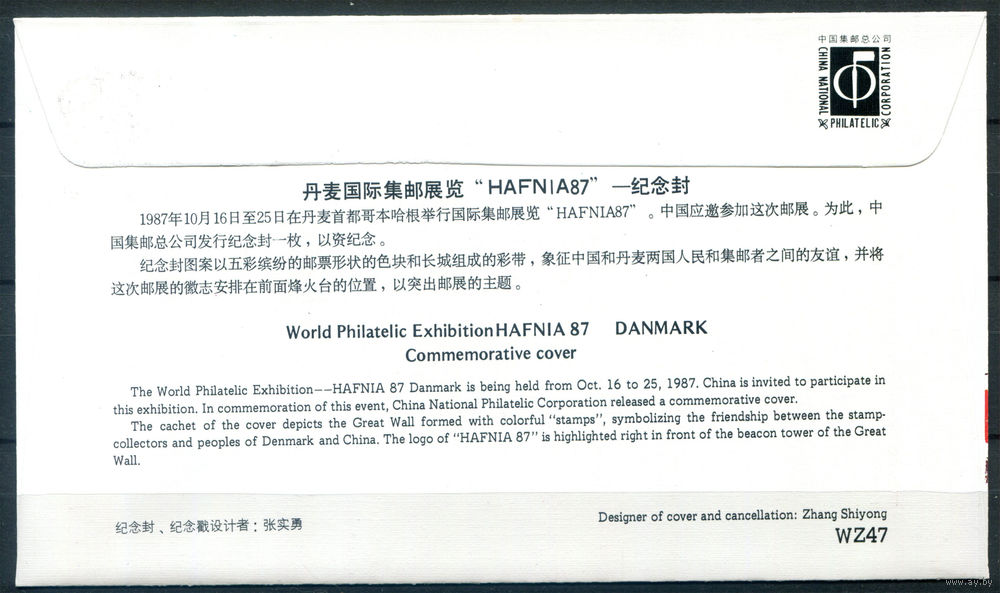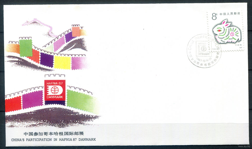 Китай - 1987г. - год кролика, участие Китая в HAFNIA 87 в Дании, FDC/КПД - 1 конверт с филателистическим гашением - . #3-WB-102-CP-20