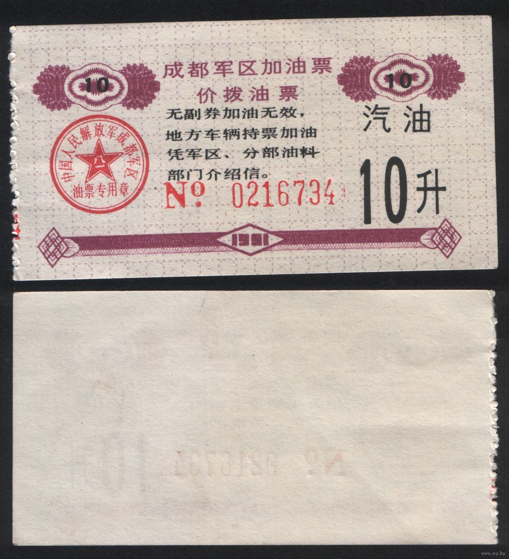 Китай 1991 год Чэндусский военный округ топл.талон (бензин) на 10л (топливо) 0216734 (rd06 =