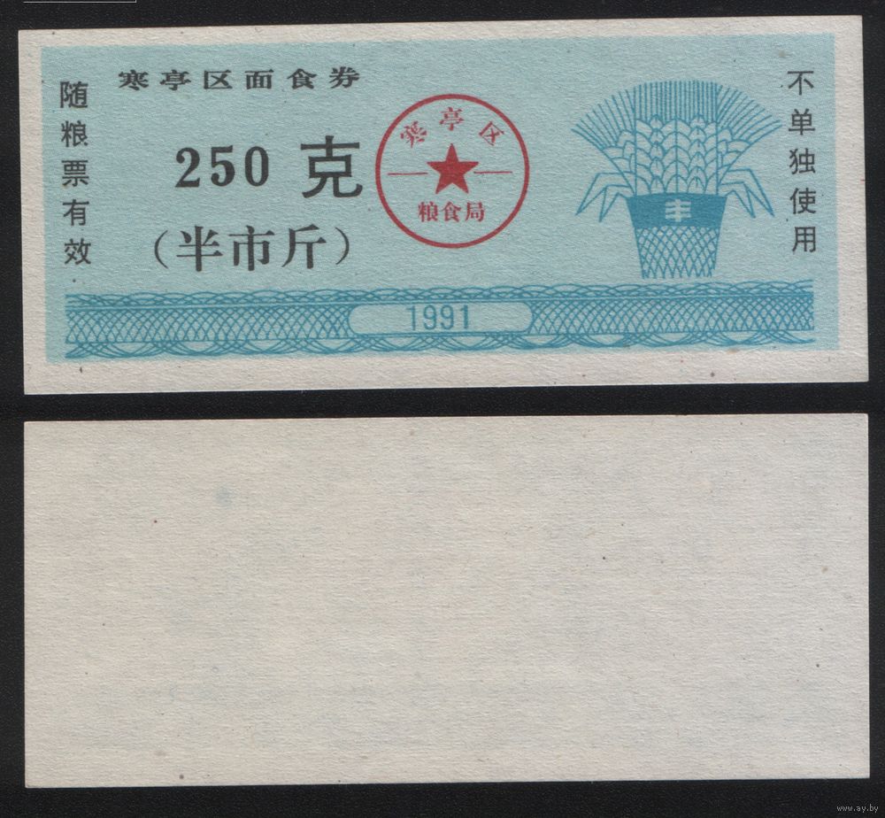 Китай 1991 год Ханьтинский район прод.талон (лапша) на 250ед=5лян=250г (рис) (rd06 =