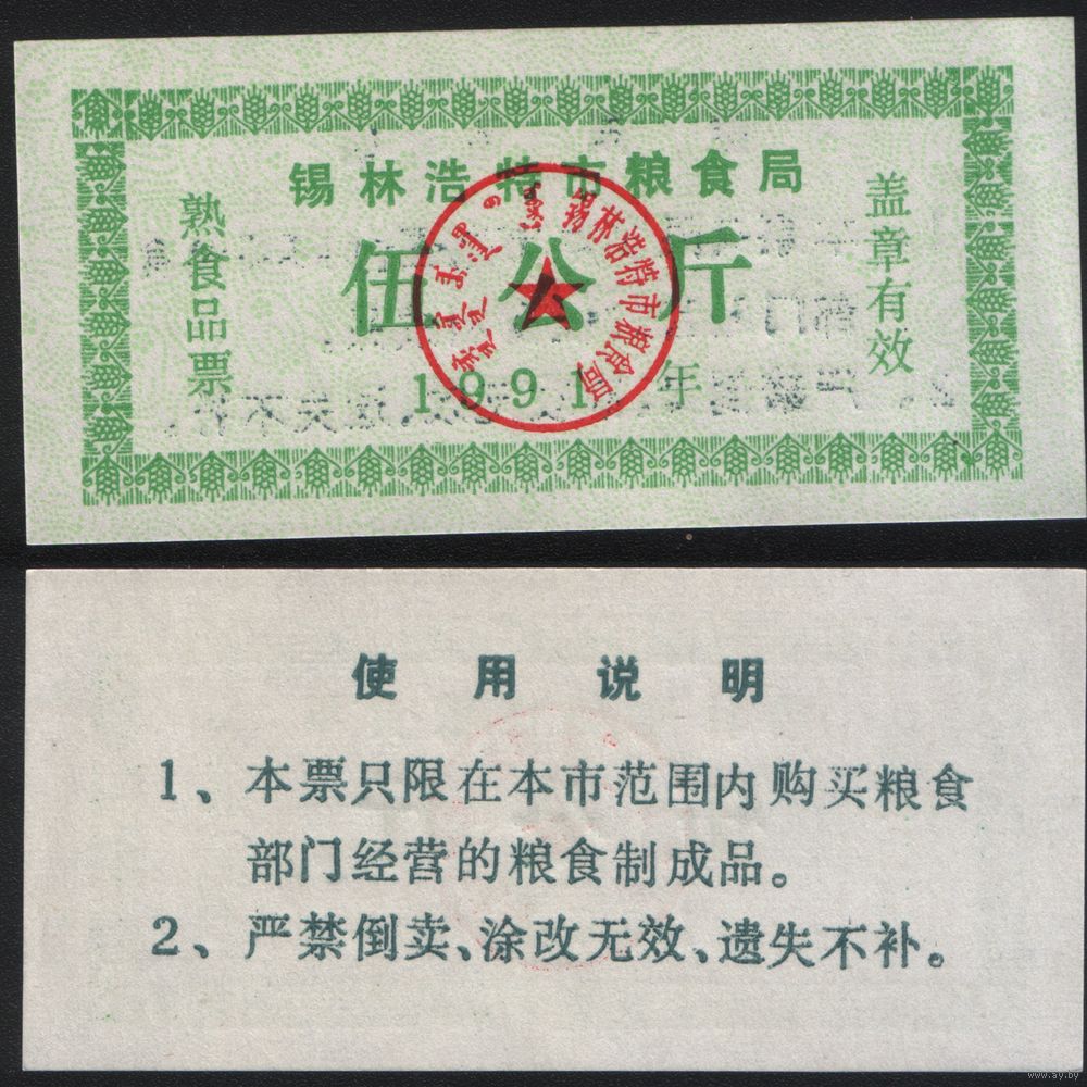 Китай 1991 год Силиньхот (Силинь) зерновое бюро Наньлинхот прод.талон на 5кг (rd01