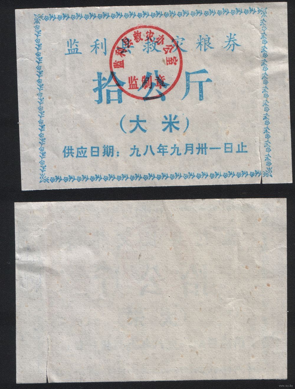 Китай 1998 год Цзяньли округ Ли прод.талон (рис) на 10кг (до 31 сентября) (rd07 =