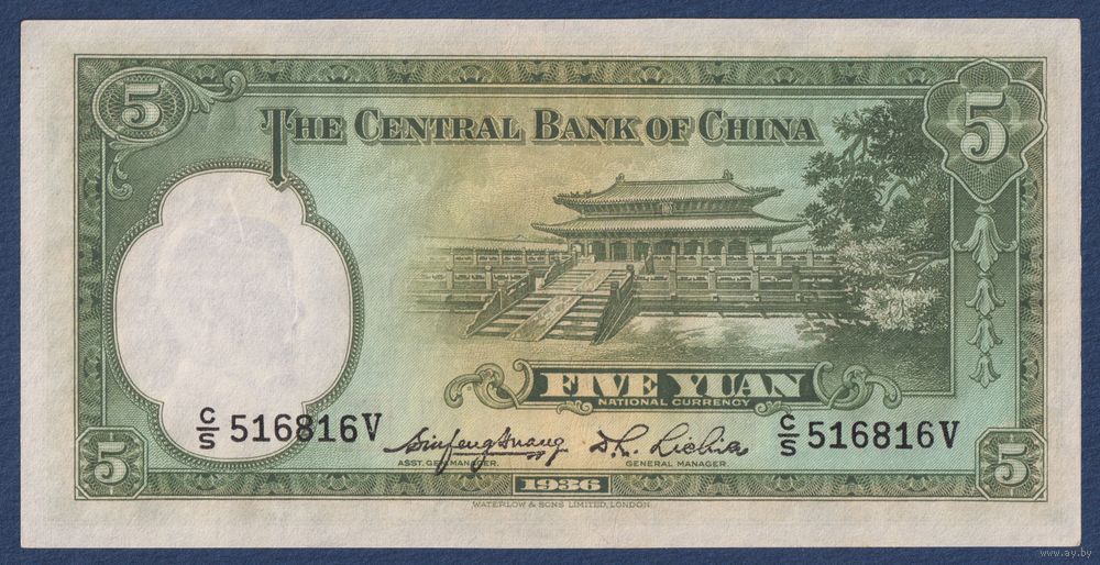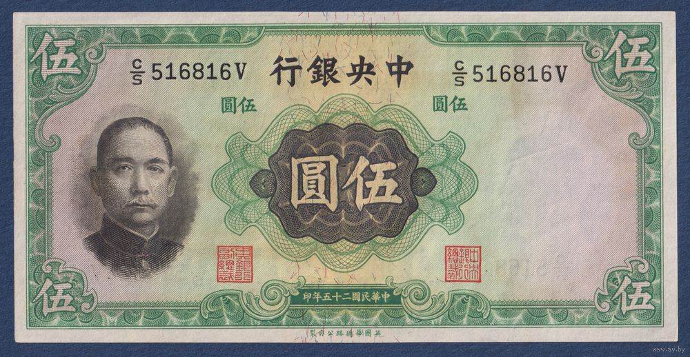 Китай, 5 юаней 1936 г, P-217a(1) (C, Сунь Ятсен), aUNC+