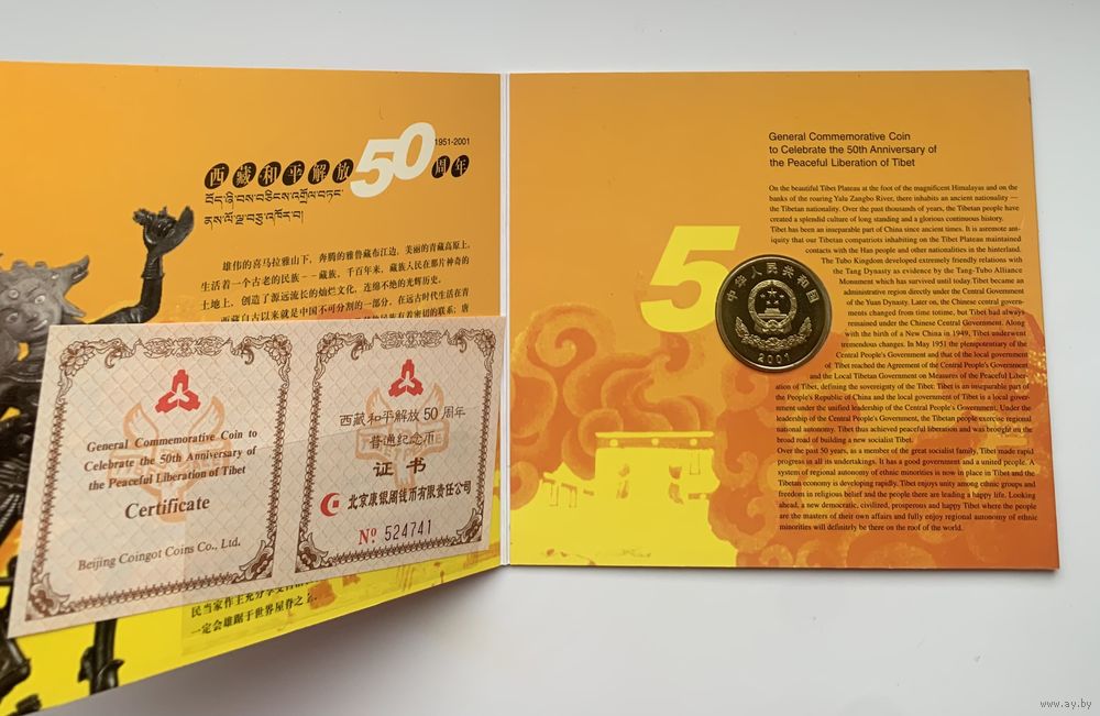 Китай 5 юаней 2001 г 50 лет Присоединение Тибета к Китаю