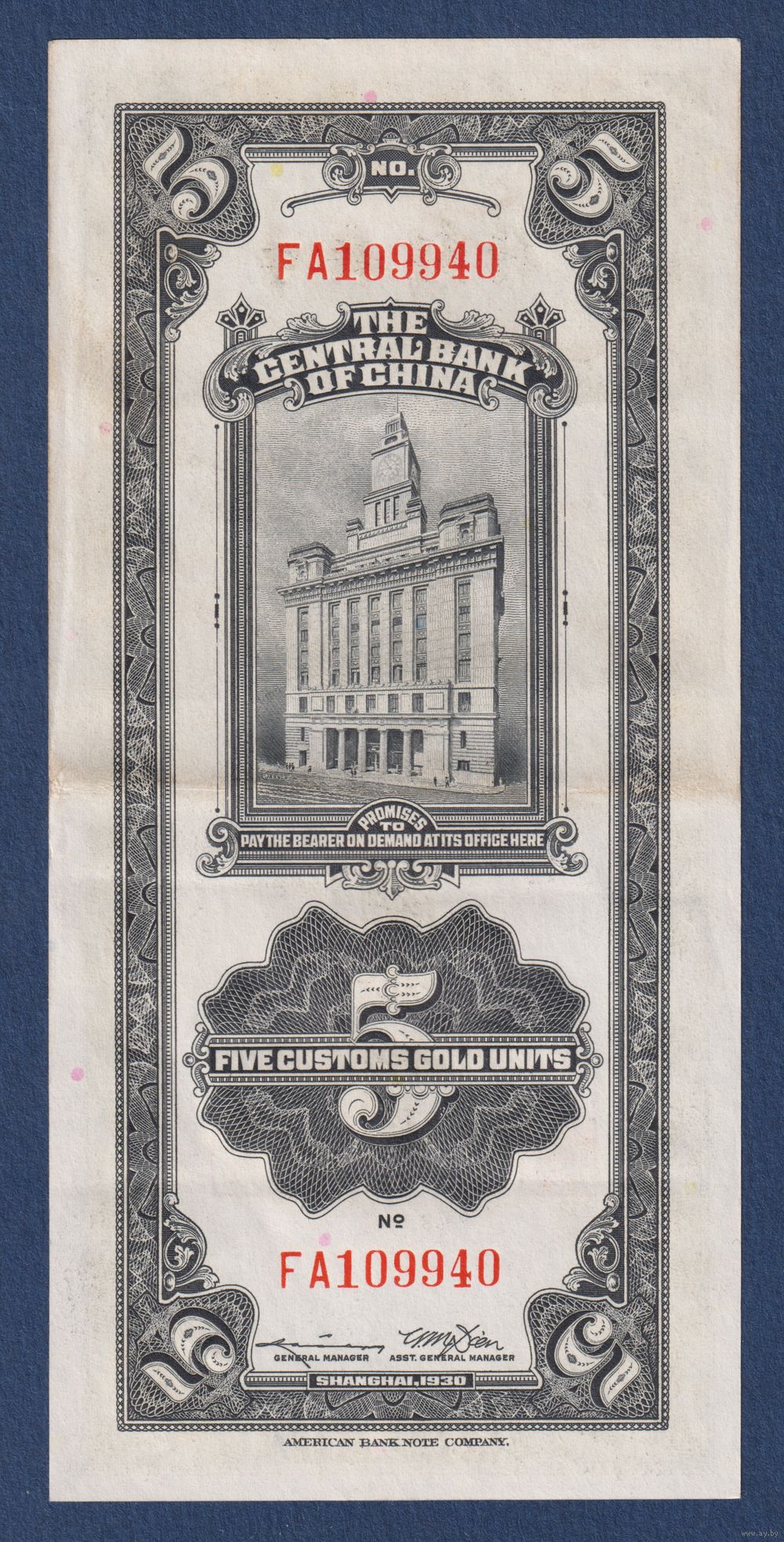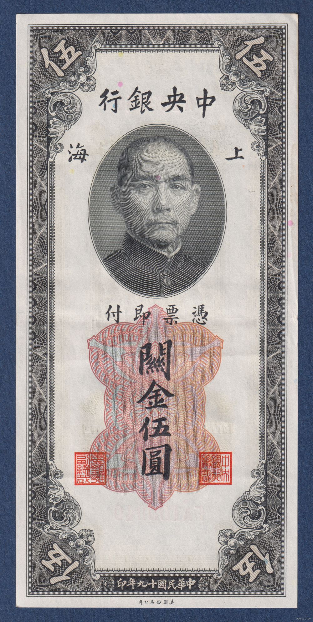Китай, 5 золотых таможенных единиц 1930 г, P-326d (FA, Сунь Ятсен, Банк Китая в Шанхае), XF-