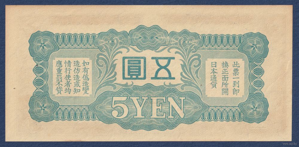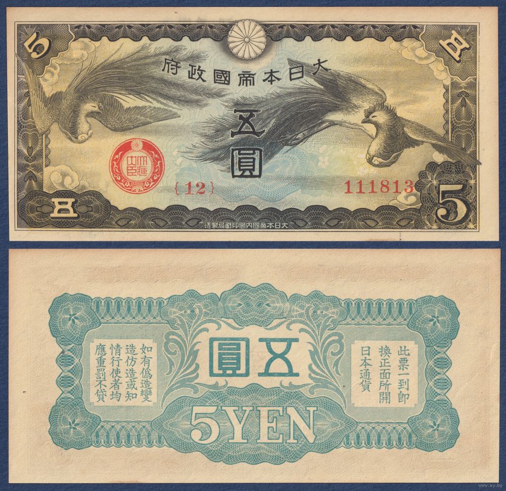 Китай (Японская оккупация), 5 йен 1940 г, P-M17a (петухи Онагадори), UNC-