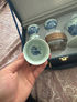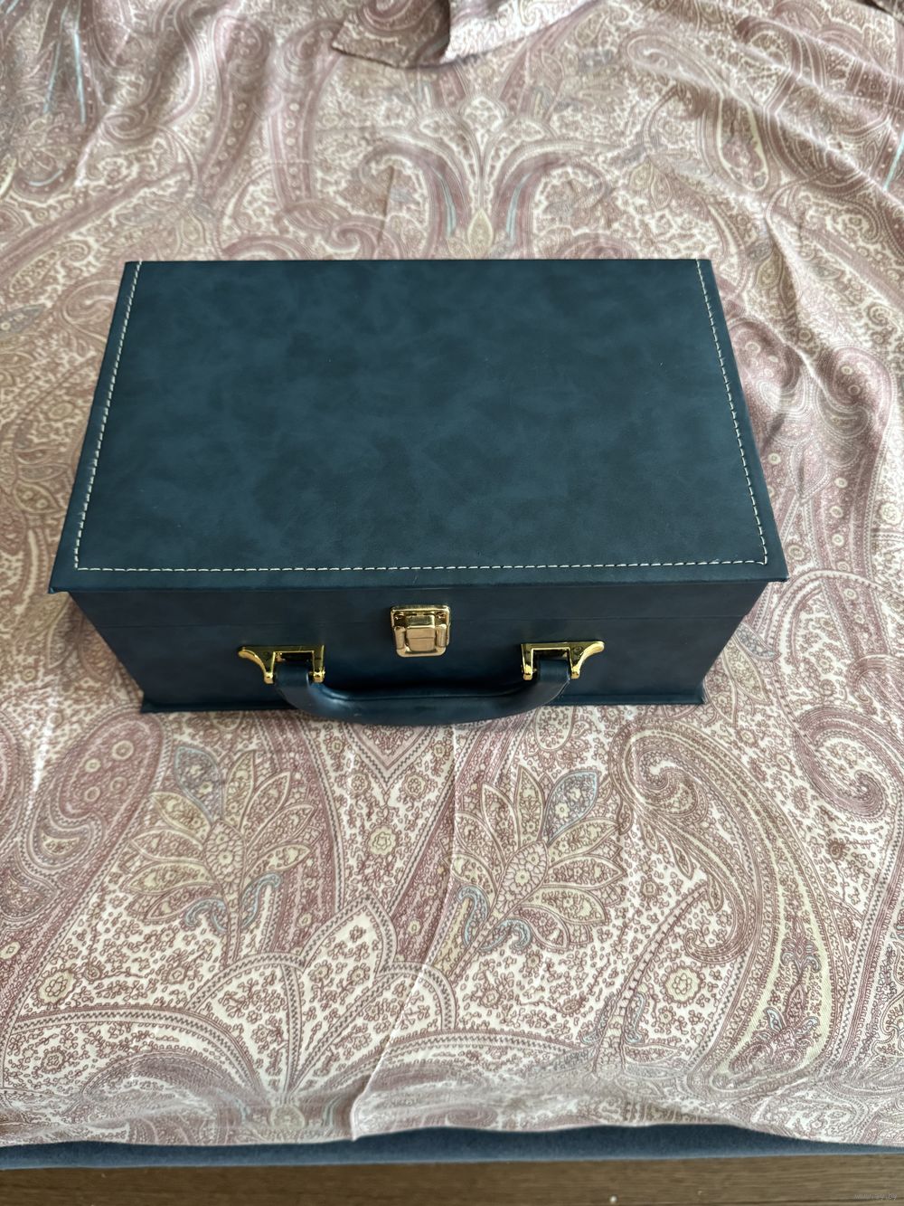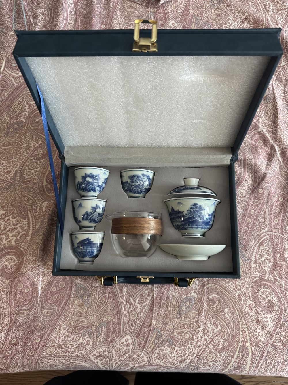 Китайский чайный набор,был куплен в Китае(Урумчи) в качестве подарка летом 2025-го ничего не сложилось,ни разу не использовался и не доставался из набора.Как доказательство,то в чашках даже пыль присутствует:).В наборе Чахай (чашка с крышкой для разлива чая,он в правом верхнем углу), 4 пиалы и стеклянная чашка для переливания чая после заварки с деревянной вставкой
