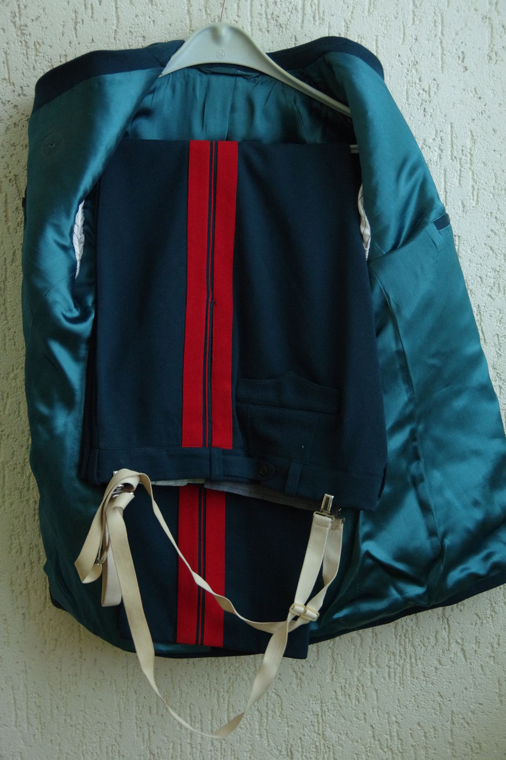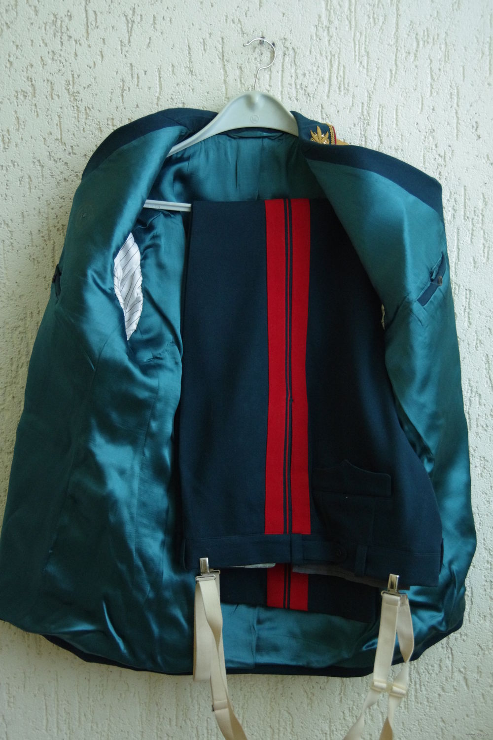 Китель - плечи 49 см , длинна рукава 72, 5 см , длинна кителя 83,5 см ; Брюки - объем 100 см , длинна 112 см