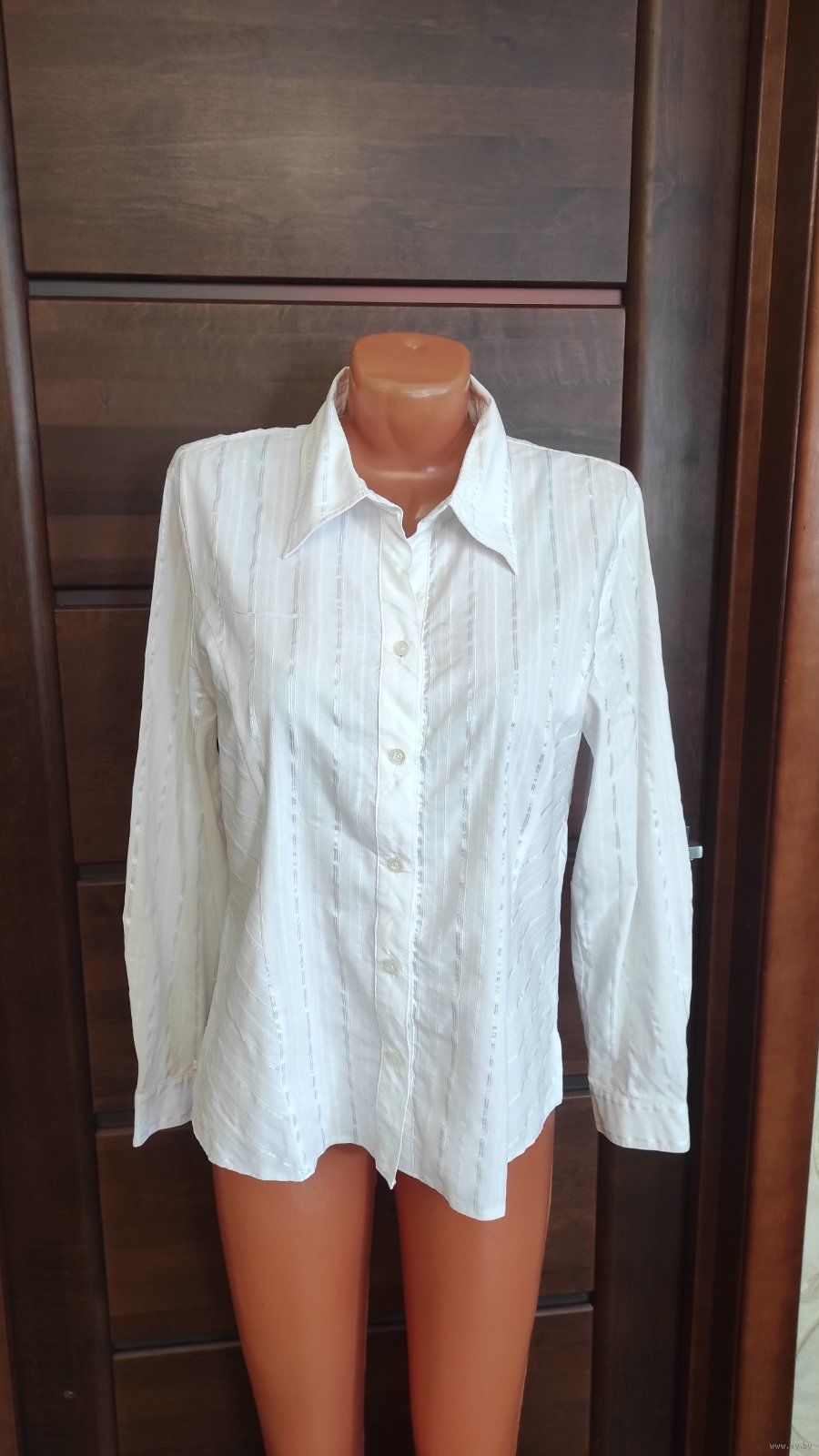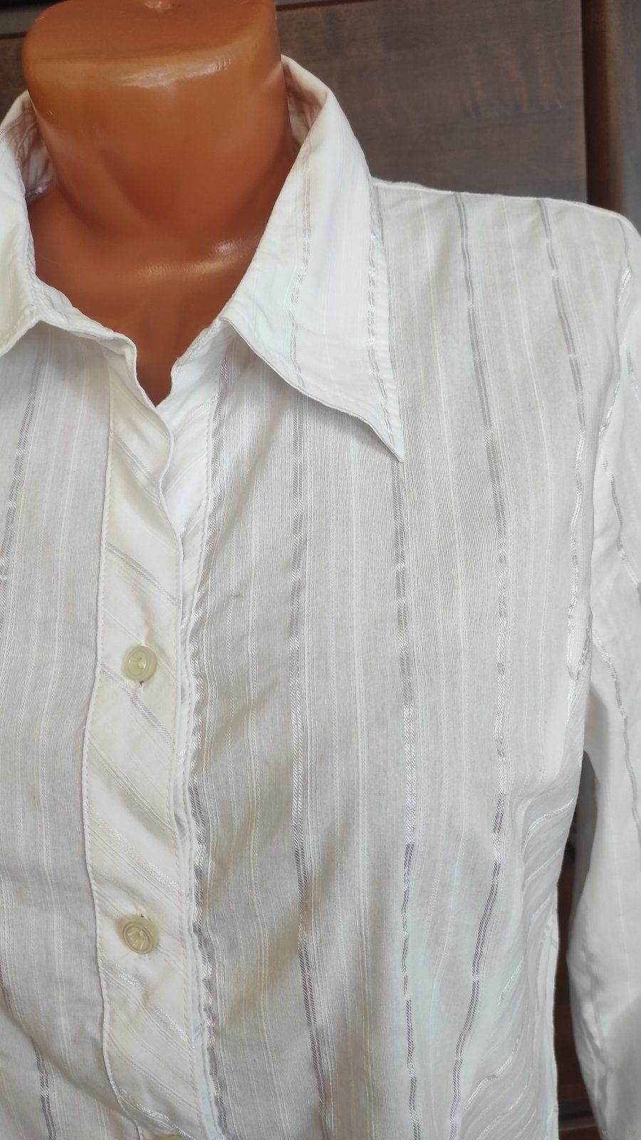 Фото 3-4. Польская светлая рубашка на 50-52 размер, в вертикальную полоску. Отлично сидит на фигуре. хорошее состояние, б/у, носила мало. Замеры: Длина 63,5 см, длина рукава 61 см, ПОгруди 54 см, ПОталии 49 см. 62% хлопка, 35% полиэстера, 3% эластана. Цена 30,00
