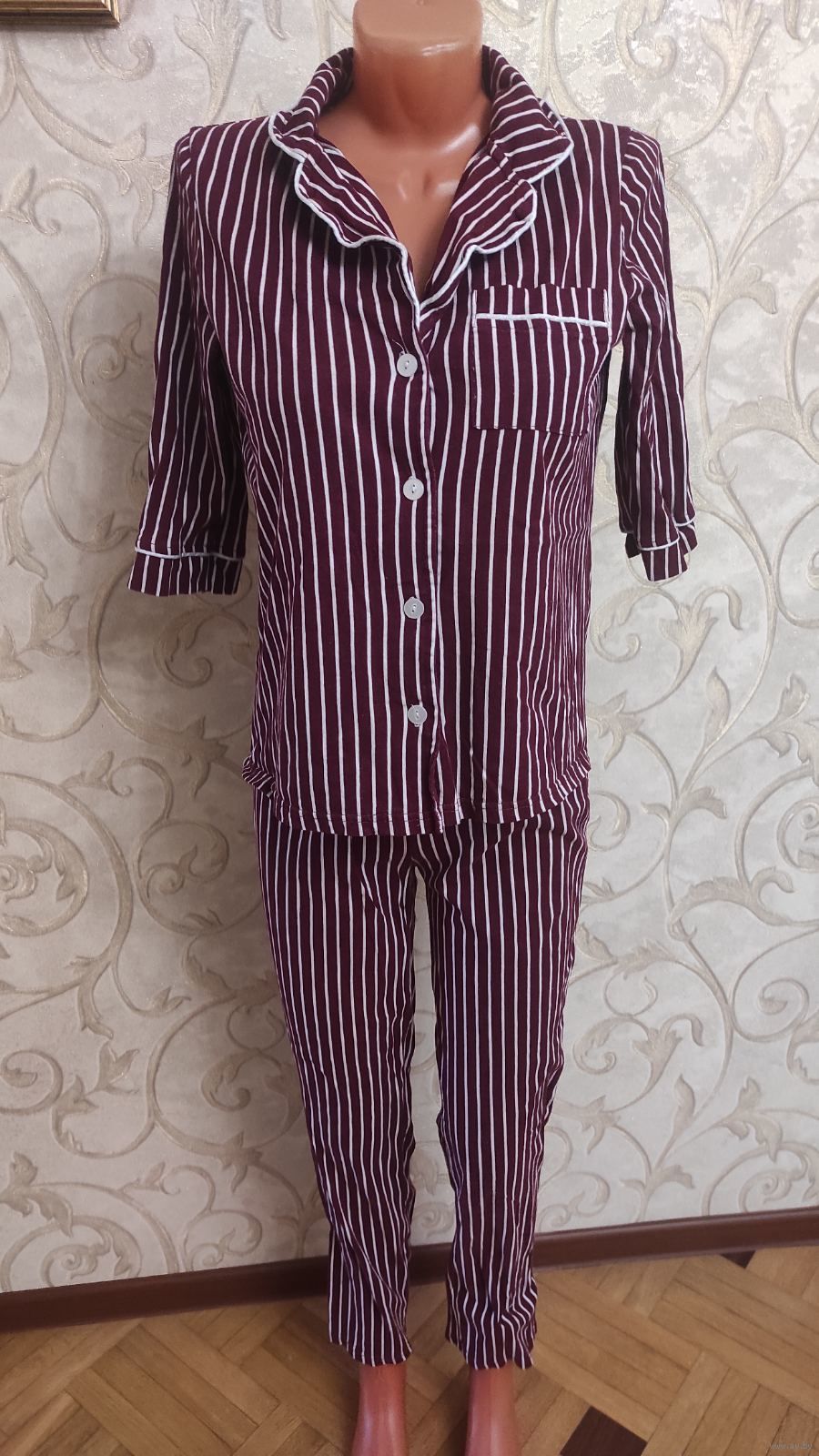 Классная пижама Makey Kelly на 44-46 размер. Цвет бордо в полоску. Хлопок б/у недолго, отличное состояние. Длина верха 60 см, ПОгруди 50 см. Штаны длина 94 см, ПОталии тянется 30-44 см.