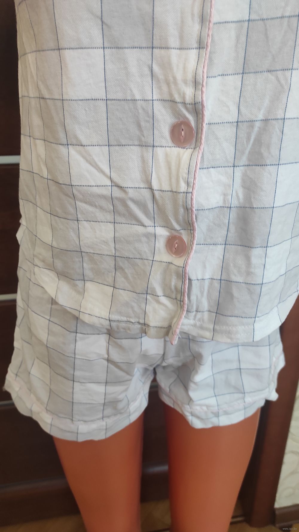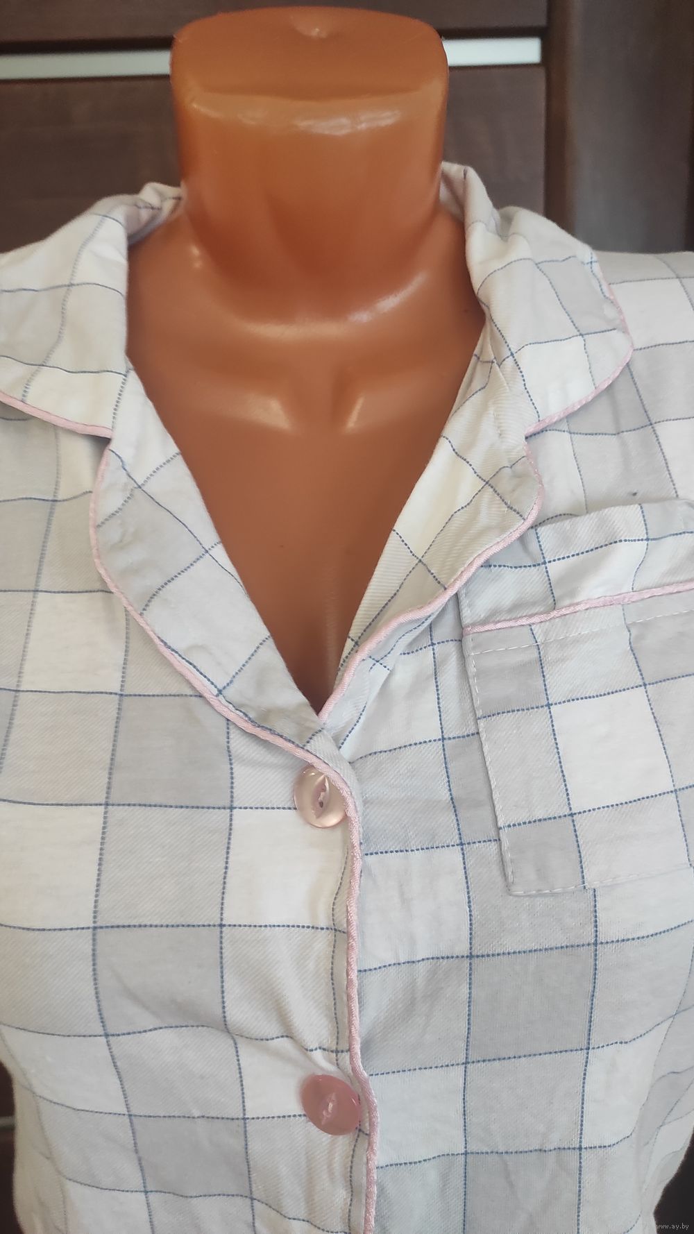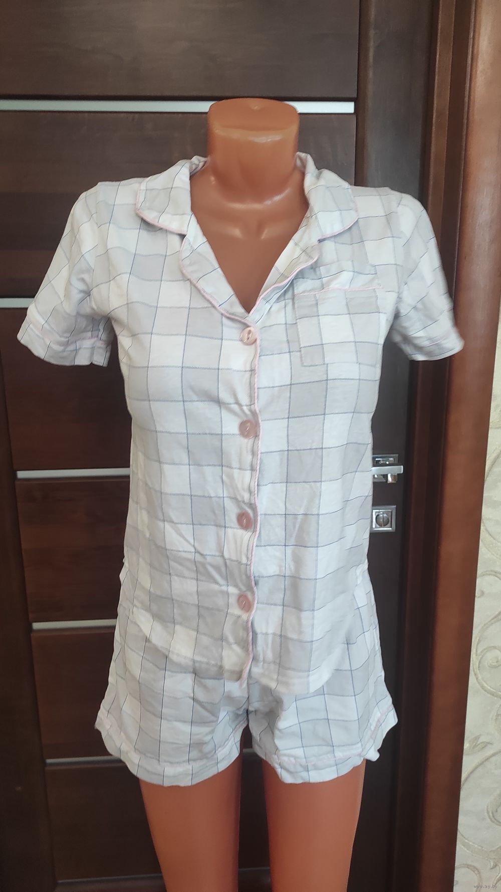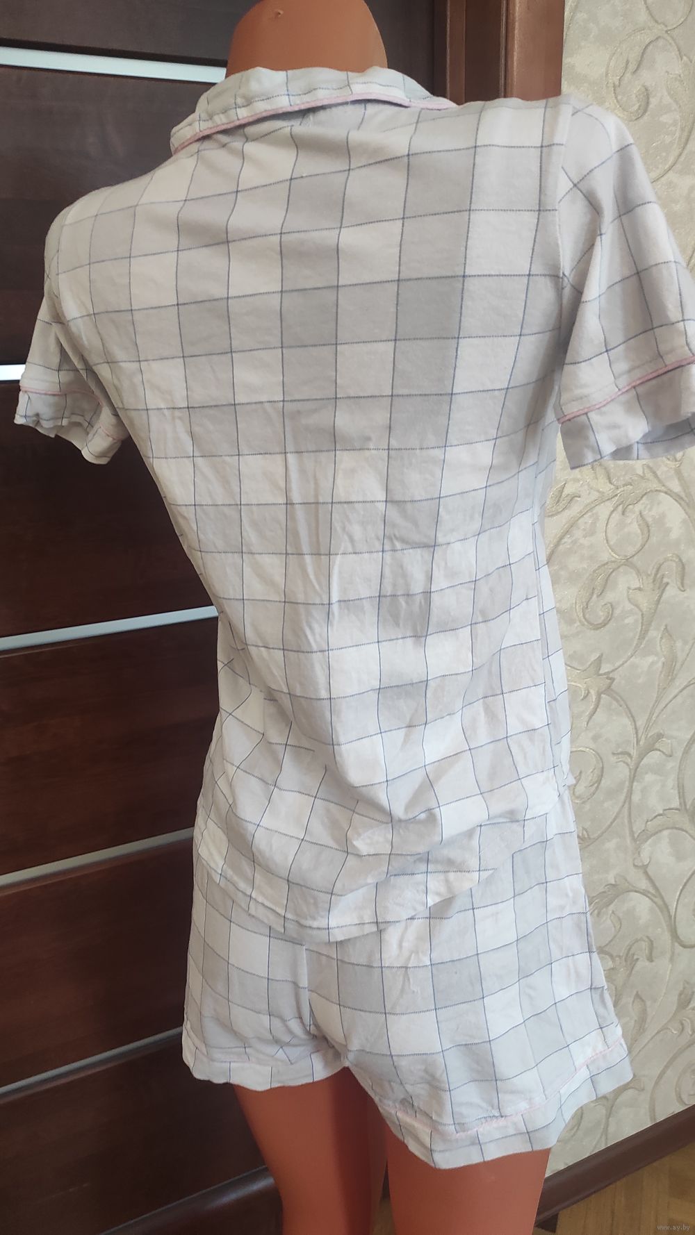 Классная пижама на 42 размер, хорошее состояние. Очнь приятная на ощупь, плотный хлопок. Кофта: ПОгруди 45 см, длина 58 см. Шорты: длина см, ПОталии тянется 27-49 см.