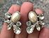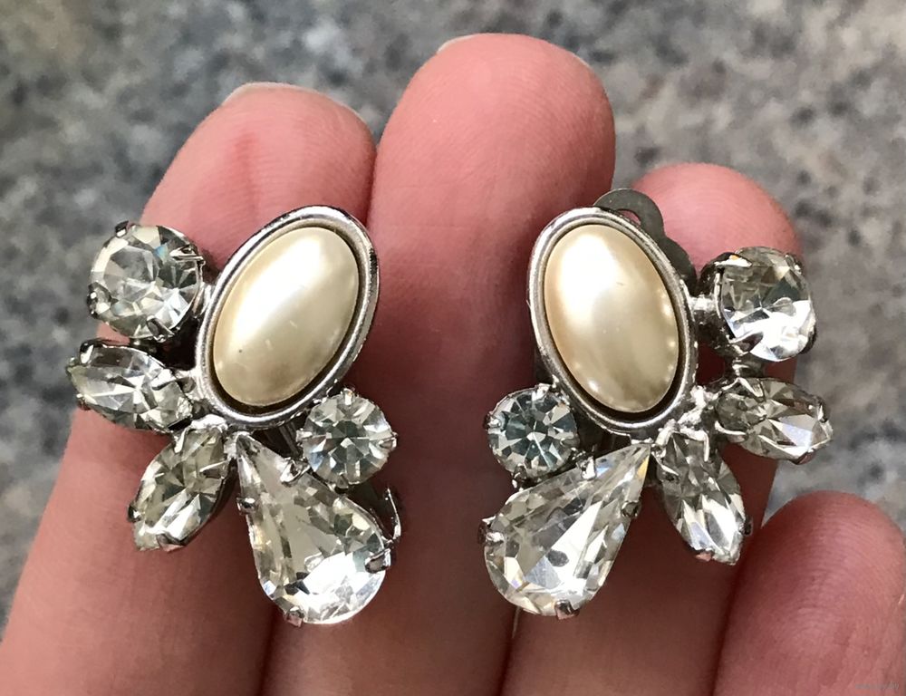 Винтажные крупные клипсы с основой из металла серебристого тона. Вставки из кристаллов и стекла с покрытием под жемчуг. Размер клипсы 2,5х2,2см. На вставках под жемчуг есть небольшие царапки.