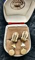 Винтажные клипсы с основой из латуни с позолотой и вставками из стекла насыщенного зелёного цвета. Высота клипсы 3,3см. Состояние хорошее.