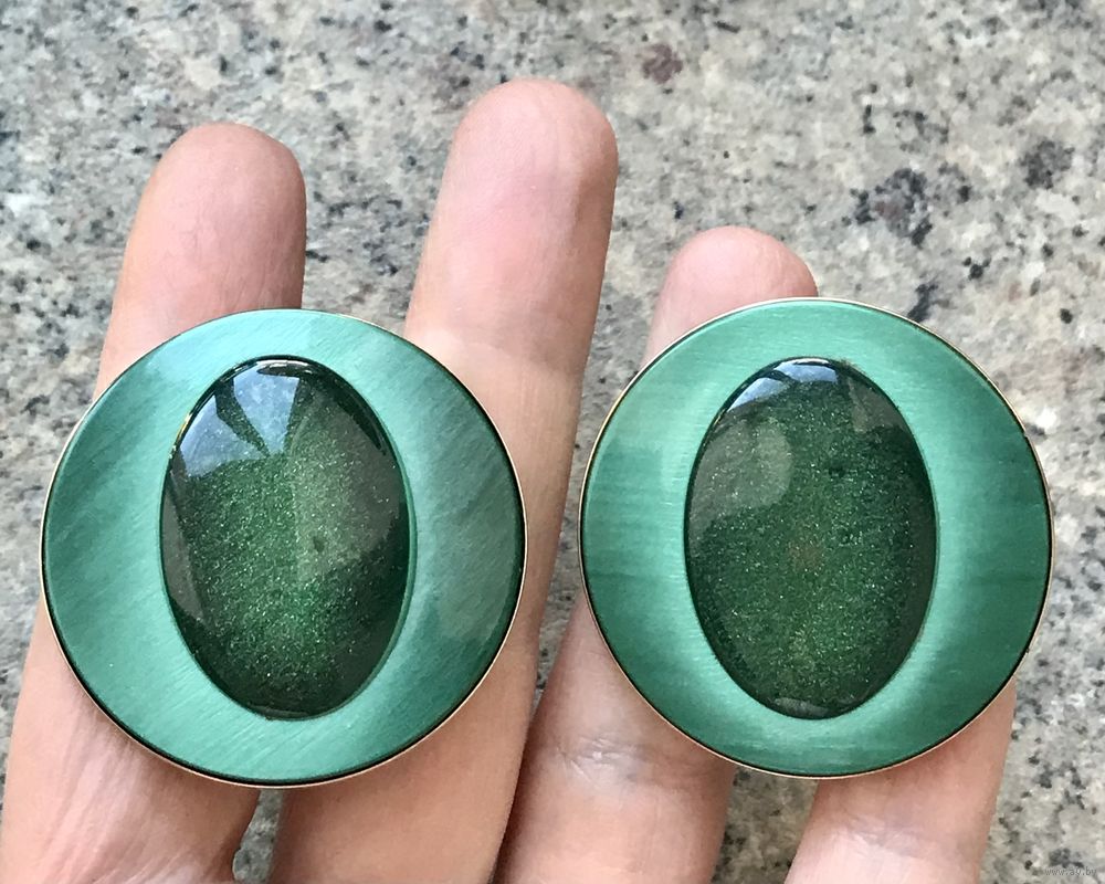 Крупные винтажные клипсы с основой из металла золотого тона, на лицевой стороне вставки из пластика. Диаметр клипсы 4см. Не тяжёлые. С обратной стороны одной клипсы на металле имеется небольшое темное пятно. Общее состояние хорошее.