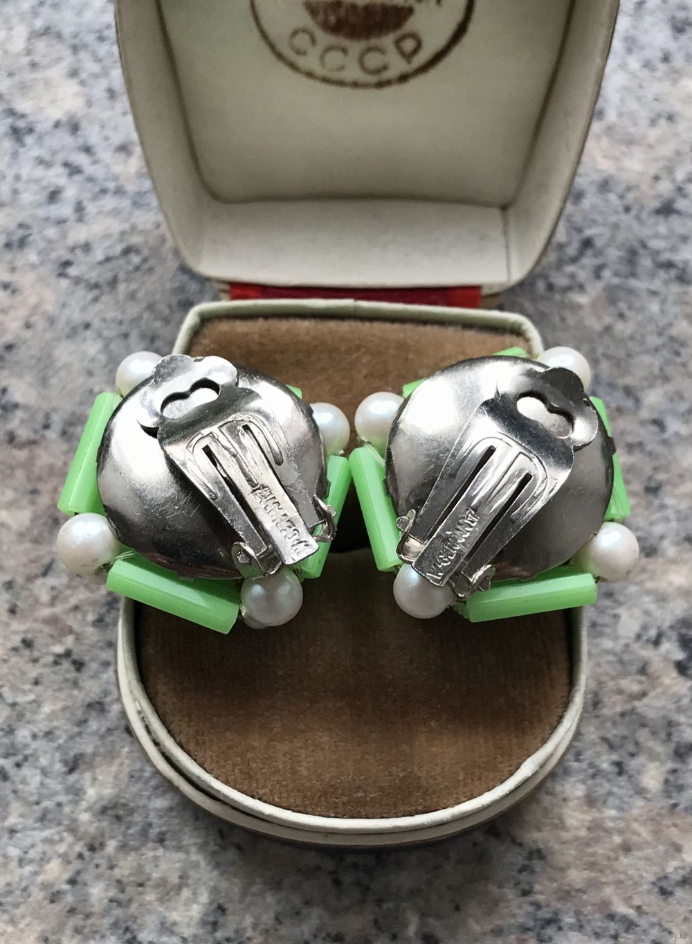 Винтажные клипсы W.Germany с основой из металла серебристого тона, на лицевой стороне центральная бусина из стекла под жемчуг, салатовые бусины из пластика. Размер 2,5х2,5см., маркированы. Состояние хорошее. В лотах есть подходящие бусы.
