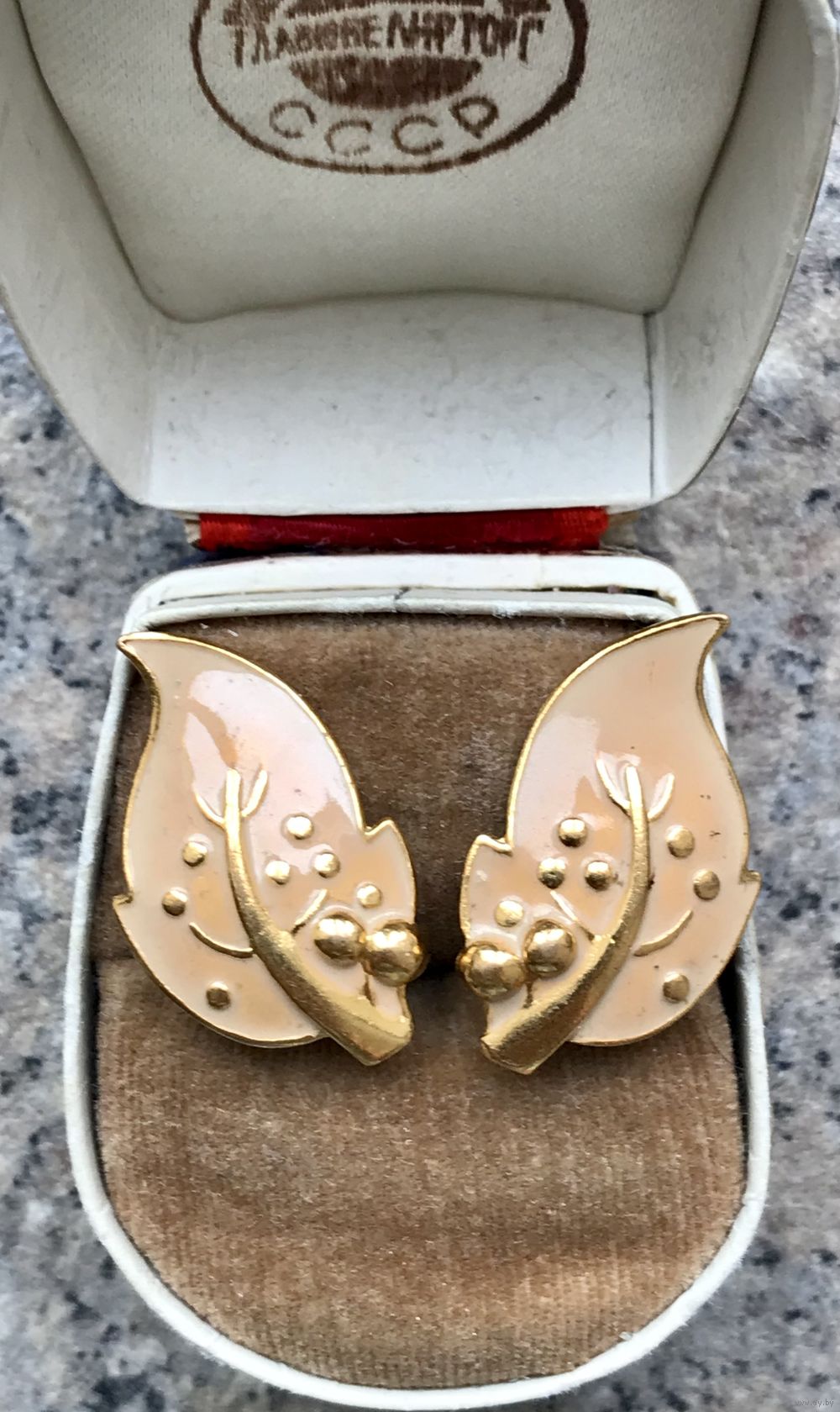 Винтажные клипсы с основой из латуни с позолотой (стоит клеймо), лицевая сторона украшена эмалью (местами имеются незначительные царапки). Размер клипсы 2,8х1,8см. Замочки держат надёжно.