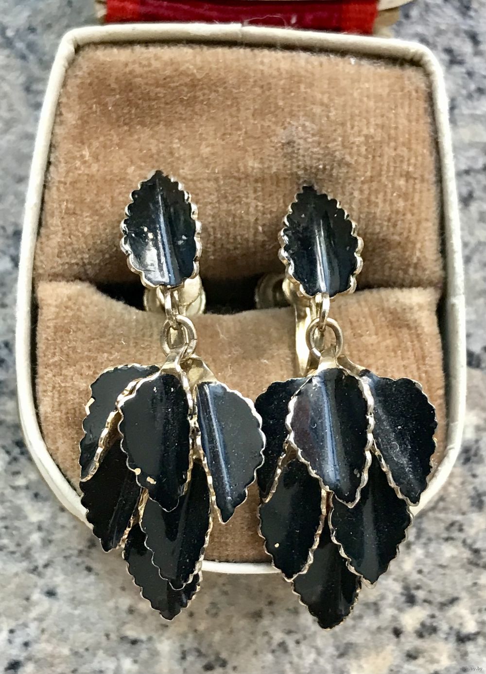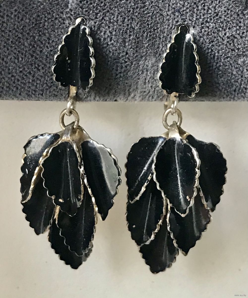 Винтажные серьги на винтах (клипсы) с основой из металла золотистого тона, лицевая сторона украшена эмалью чёрного цвета (местами есть незначительные потёртости эмали, в глаза не бросается). Высота серьги 4см. Общее состояние хорошее.
