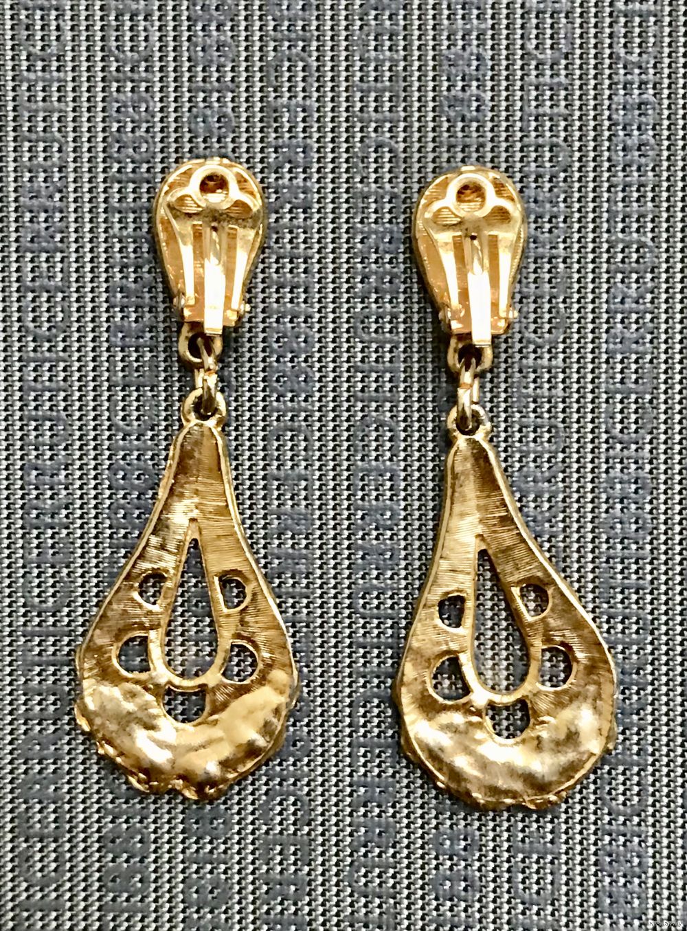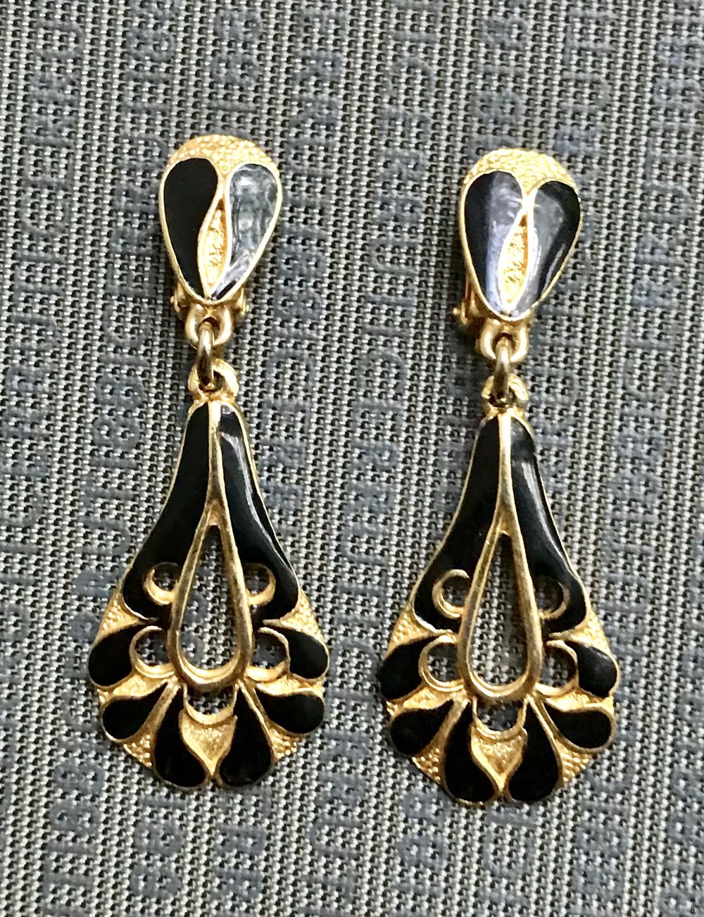 Крупные винтажные клипсы от английской компании Sphinx из качественного бижутерного сплава золотого тона, лицевая сторона украшена эмалью чёрного цвета. Высота 5,8см. Клипсы не маркированы (при желании можно найти эти клипсы в интернете). Состояние хорошее.