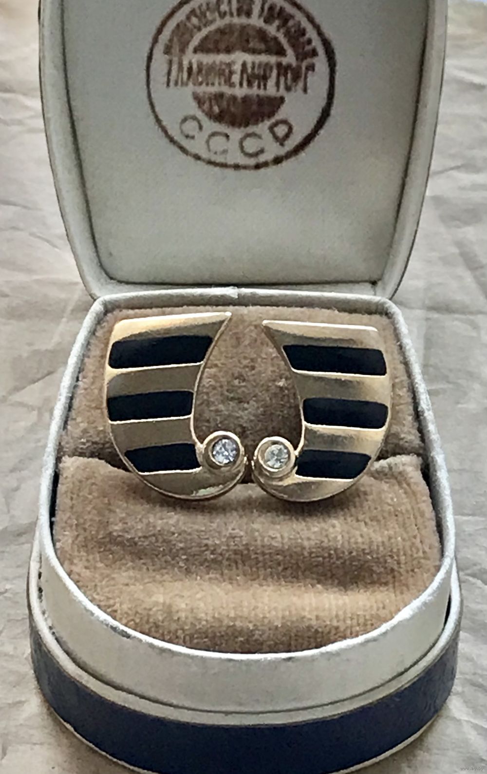 Небольшие клипсы с основой из металла золотого тона, лицевая сторона украшена эмалью чёрного цвета и кристаллом. На обратной стороне одной клипсы стоит маркировка (атрибутировать не удалось). Высота клипсы 2см. Состояние хорошее.