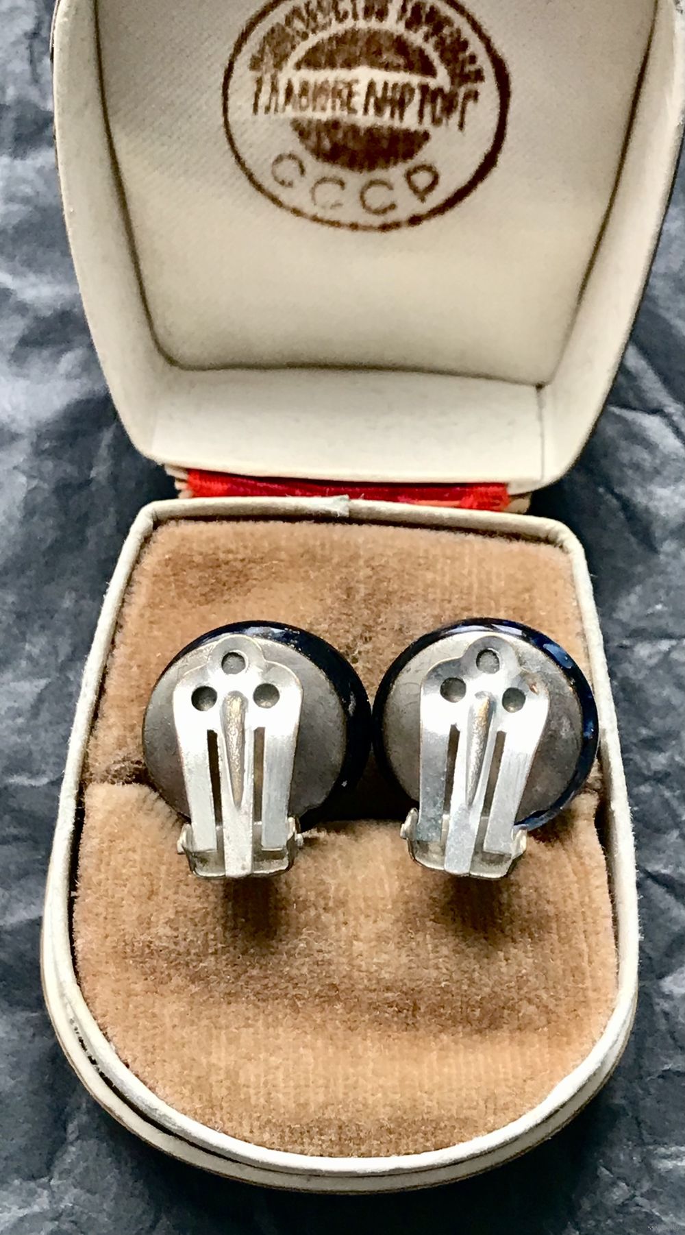 Винтажные клипсы с основой из металла серебристого тона, вставки-кабошоны из художественного стекла диаметром 1,5см. Состояние хорошее.