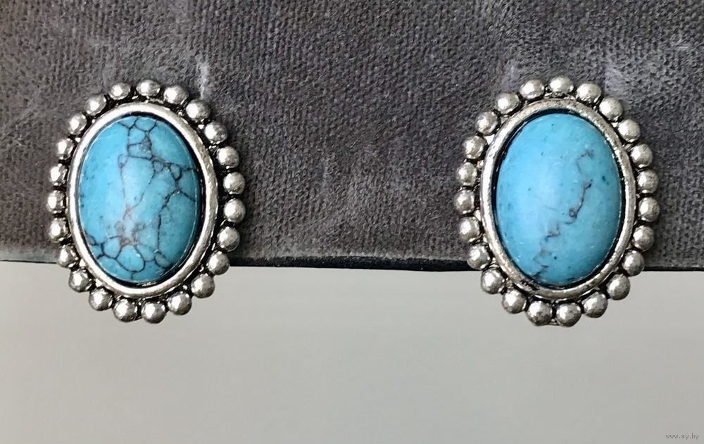 Клипсы с основой из металла серебристого тона и вставок из стекла под бирюзу. Размер клипсы 2,2х1,8см. Состояние хорошее.