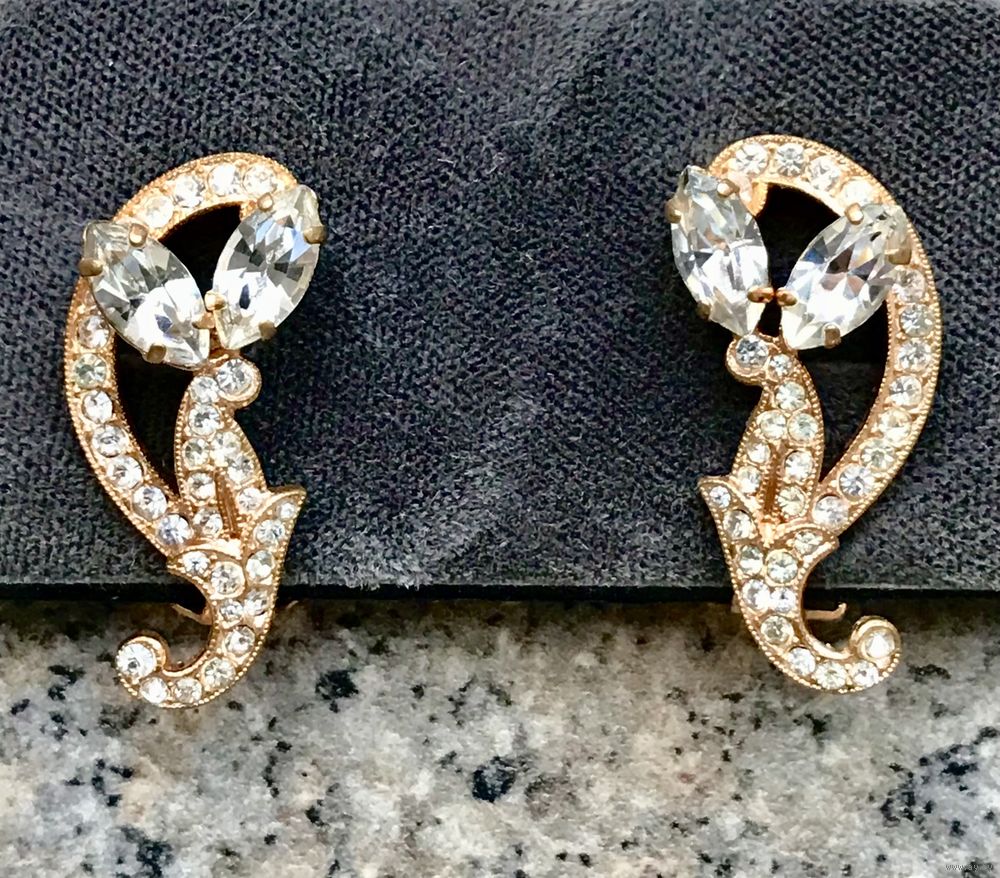 Крупные клипсы с основой из металла золотого тона, лицевая сторона украшена кристаллами разных размеров. Высота клипсы 3см., застёжки в порядке. Состояние хорошее.