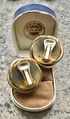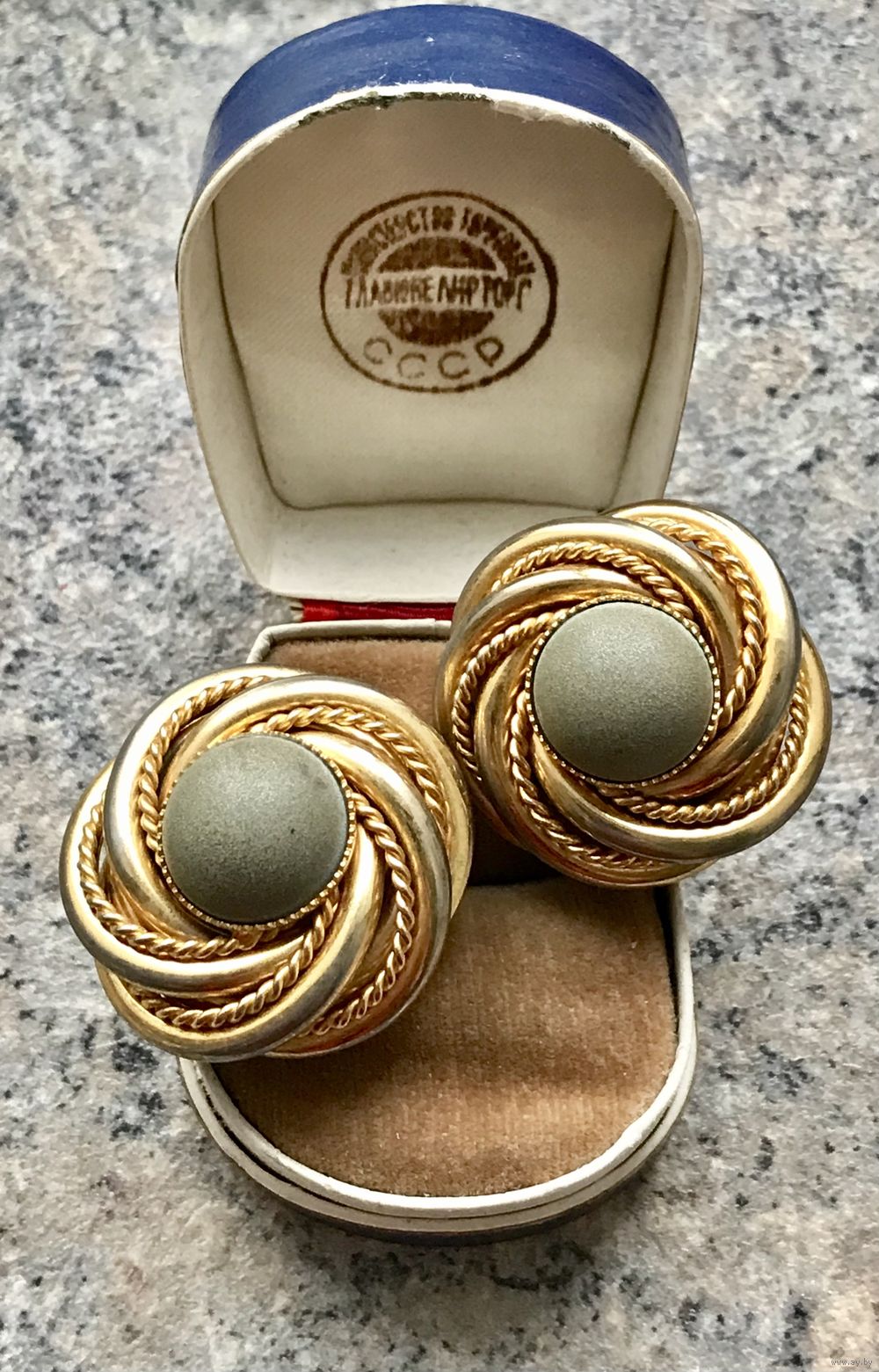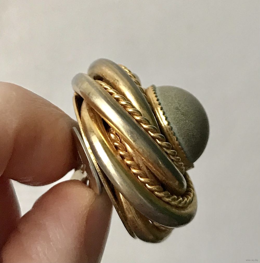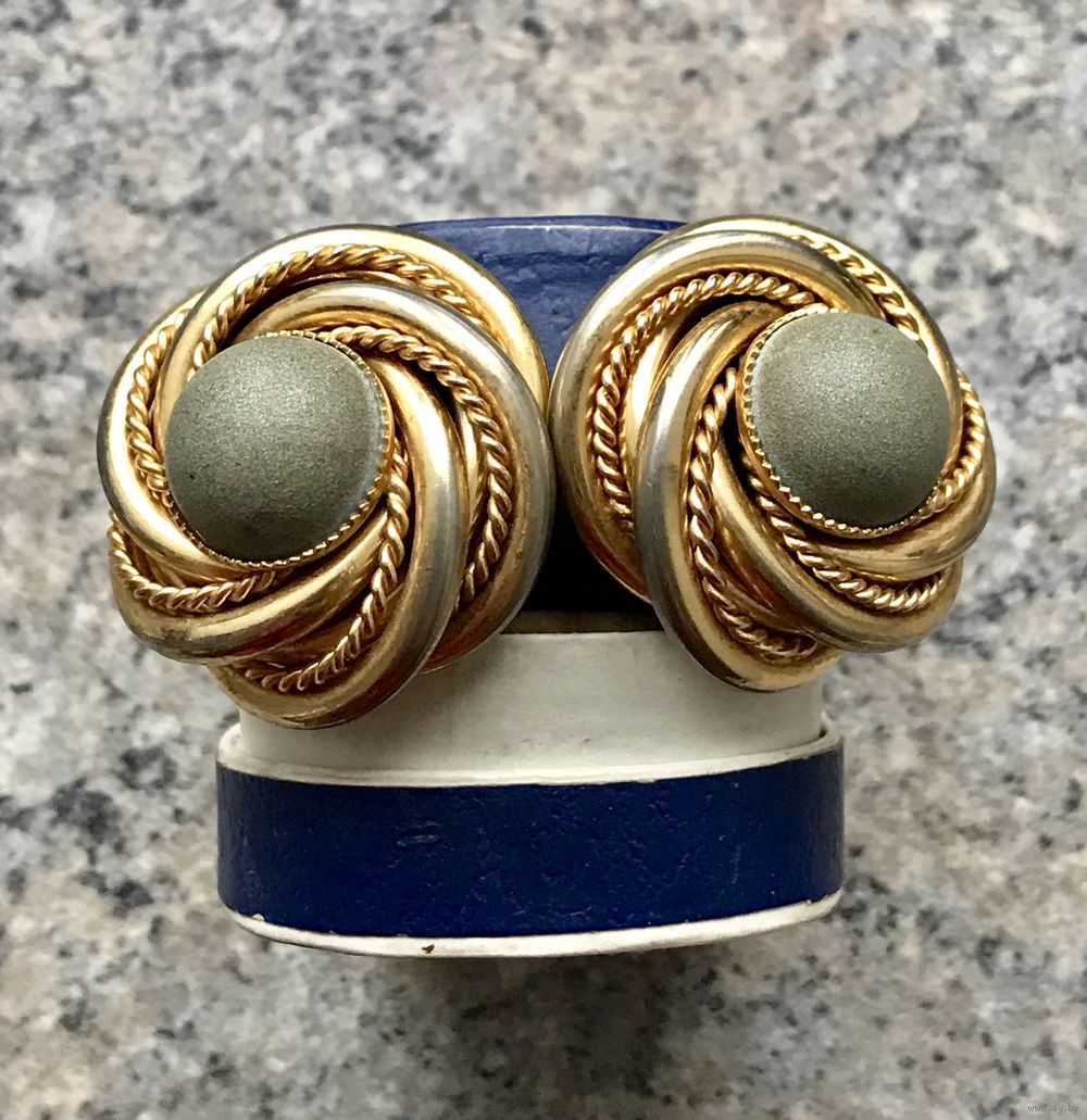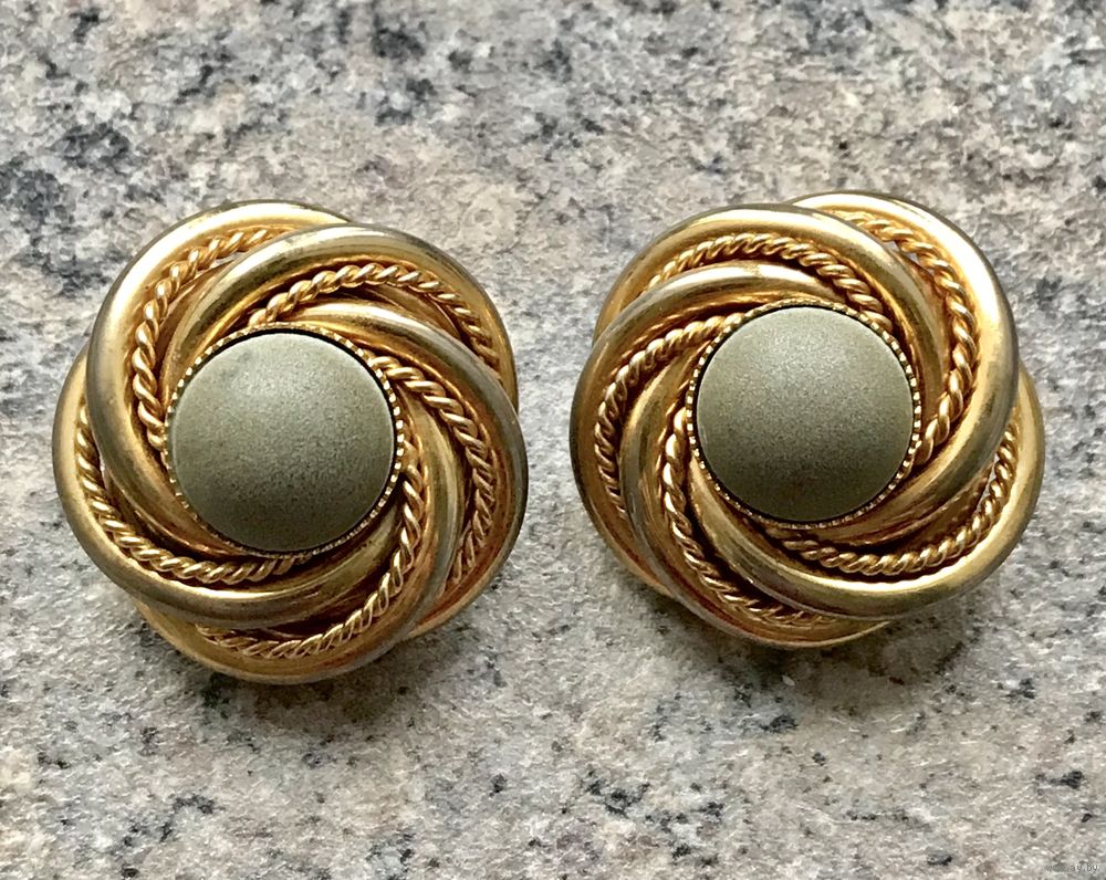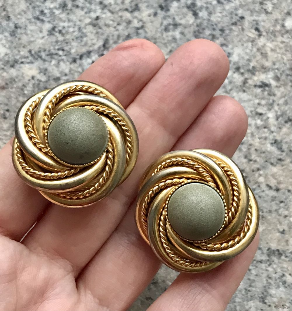 Крупные винтажные клипсы из металла золотого тона. Вставки из полимера. С лицевой и обратной стороны имеются потёртости позолоты, что придаёт только шарм украшению. Диаметр клипсы 3см. Застёжки держат надёжно.