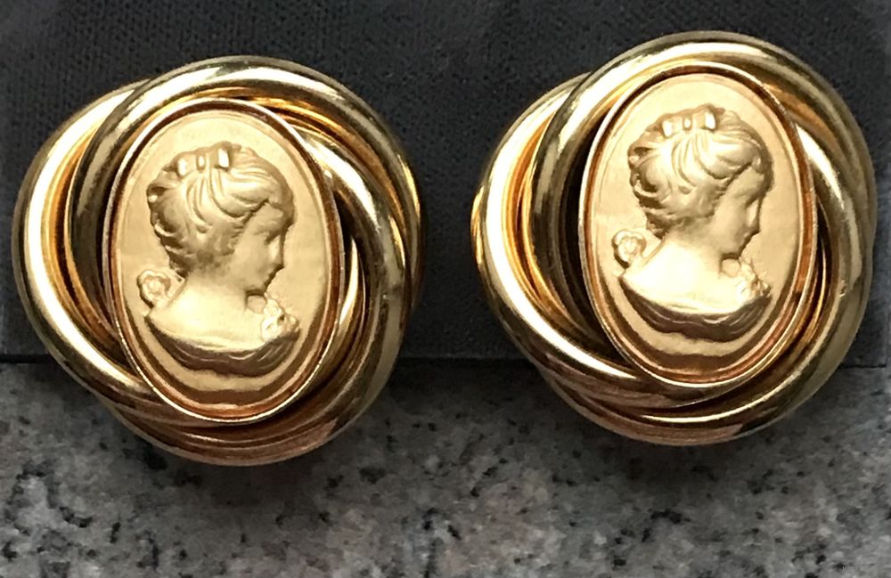 Крупные винтажные клипсы с камеями из бижутерного сплава с позолотой. Размер 3,5х3,5см. Замочки держат надёжно. Состояние хорошее.