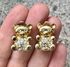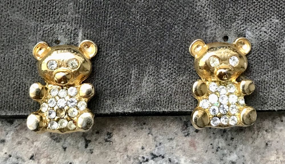 Винтажные клипсы в виде мишек Тедди из металла золотого тона, лицевая сторона украшена кристаллами (одного не хватает). Размер клипсы 2х1,5см. Общее состояние хорошее.