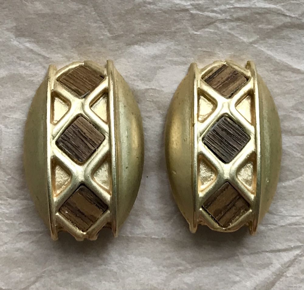 Крупные винтажные клипсы из металла цвета матового золота, на лицевой стороне вставки из дерева. Размер клипсы 3,7х2,5см. Имеют приятный вес. Состояние хорошее.
